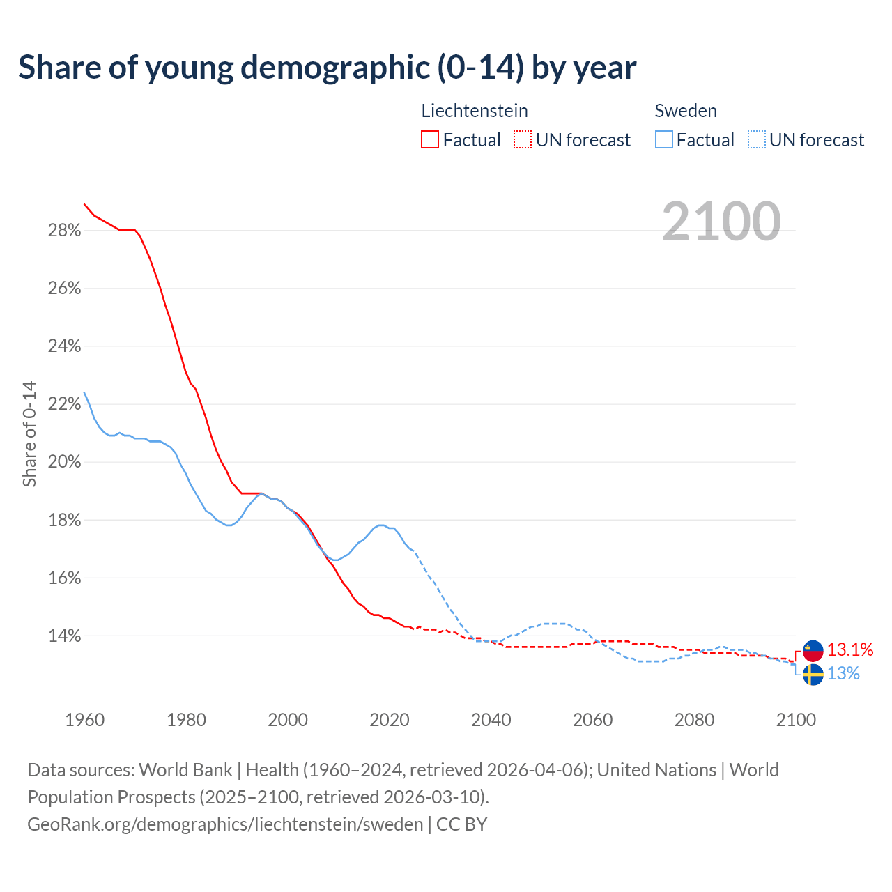 - The share of young demographic (0-15 years old) in Liechtenstein is 14.3% vs 17% in Sweden.