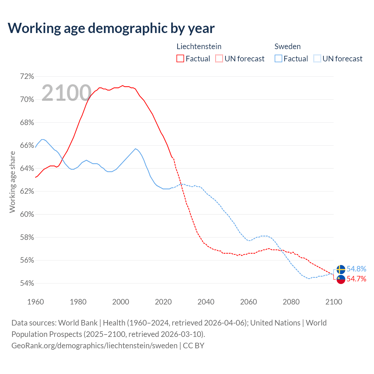 - Liechtenstein has 26.7K working age adults (aged 15-64) vs 6.65M in Sweden.