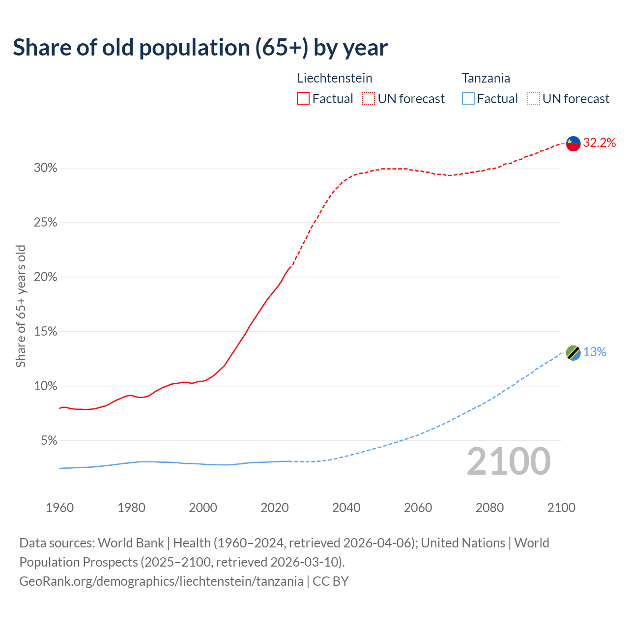 The share of older people aged 65 and over is 20.7% in Liechtenstein and 3.05% in Tanzania. Life expectancy in Liechtenstein compared to Tanzania .