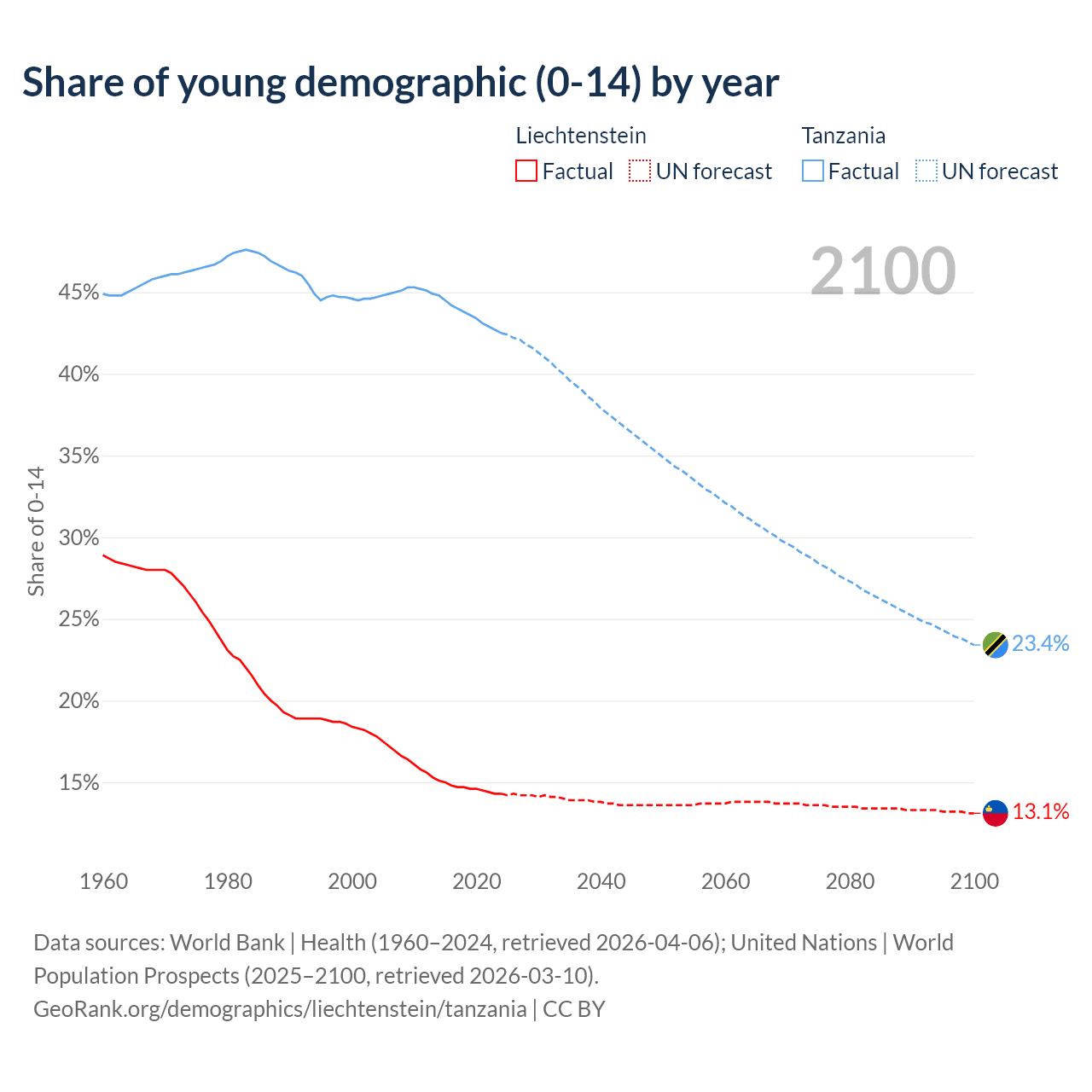 - The share of young demographic (0-15 years old) in Liechtenstein is 14.3% vs 42.5% in Tanzania.