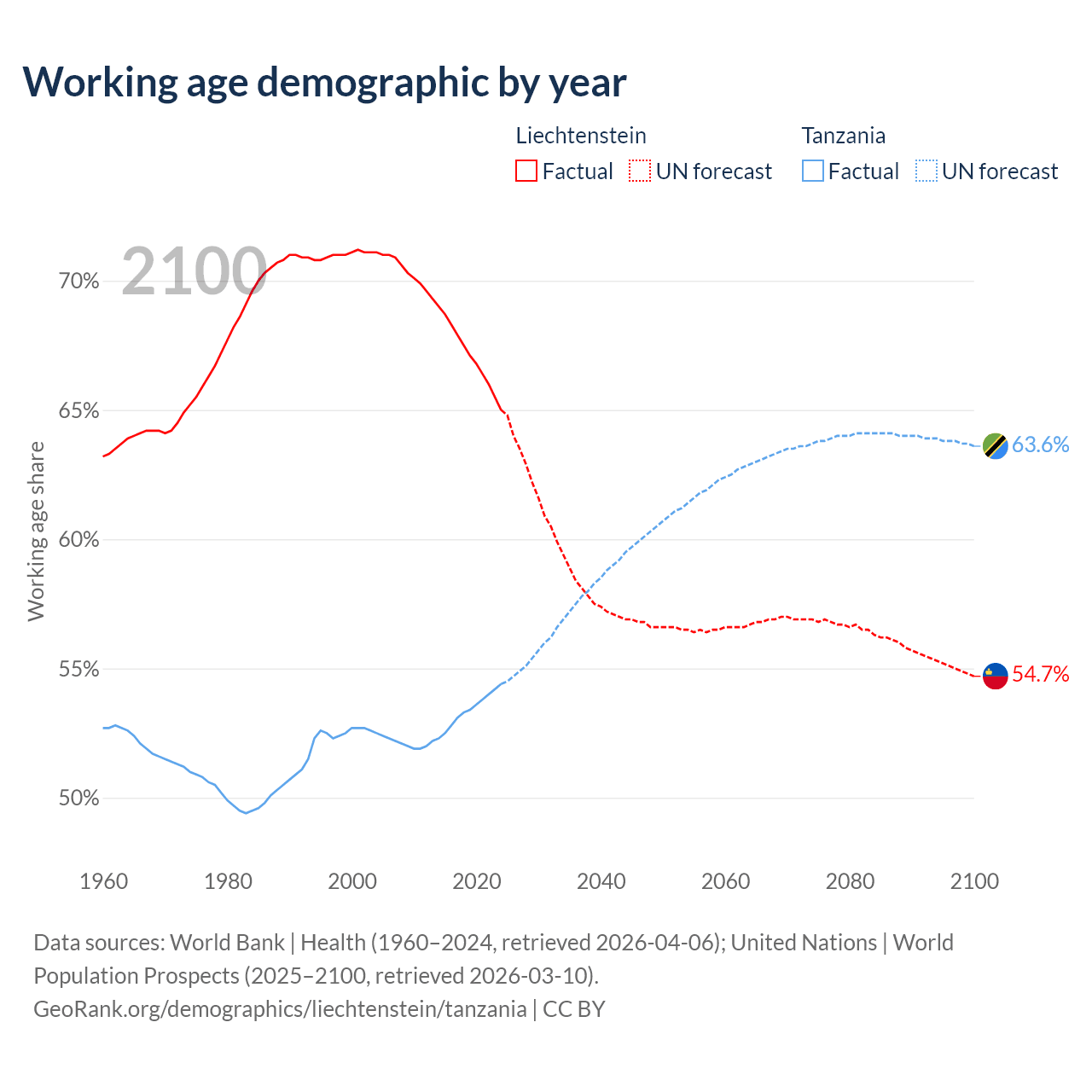 - Liechtenstein has 26.7K working age adults (aged 15-64) vs 39.8M in Tanzania.