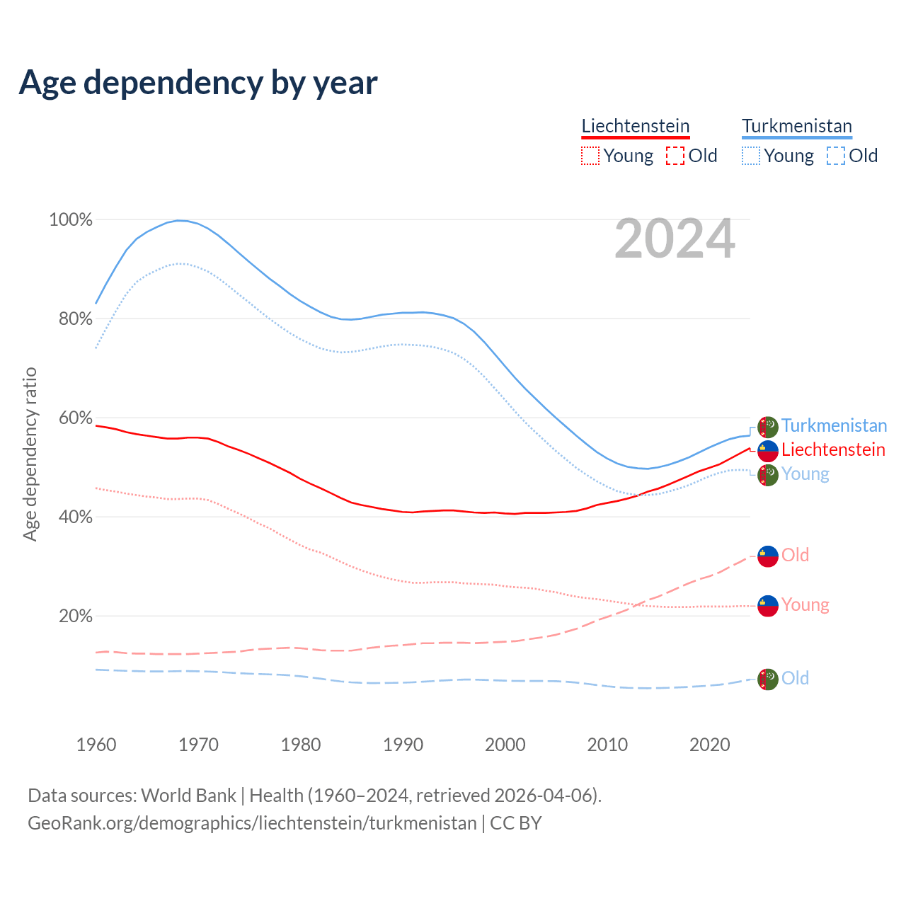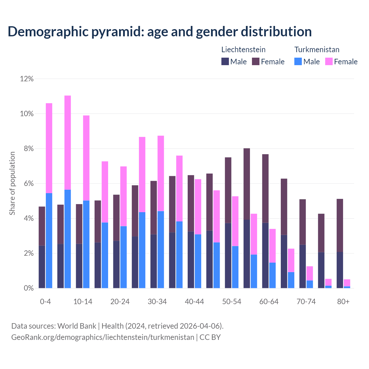 - Liechtenstein is ranked 13/196 by median age (oldest to youngest) vs 119/196 for Turkmenistan.