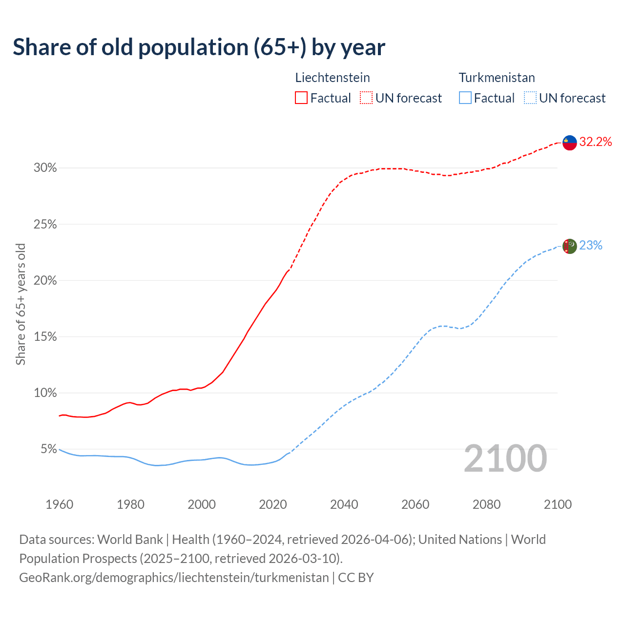 The share of older people aged 65 and over is 20.7% in Liechtenstein and 4.53% in Turkmenistan. Life expectancy in Liechtenstein compared to Turkmenistan .