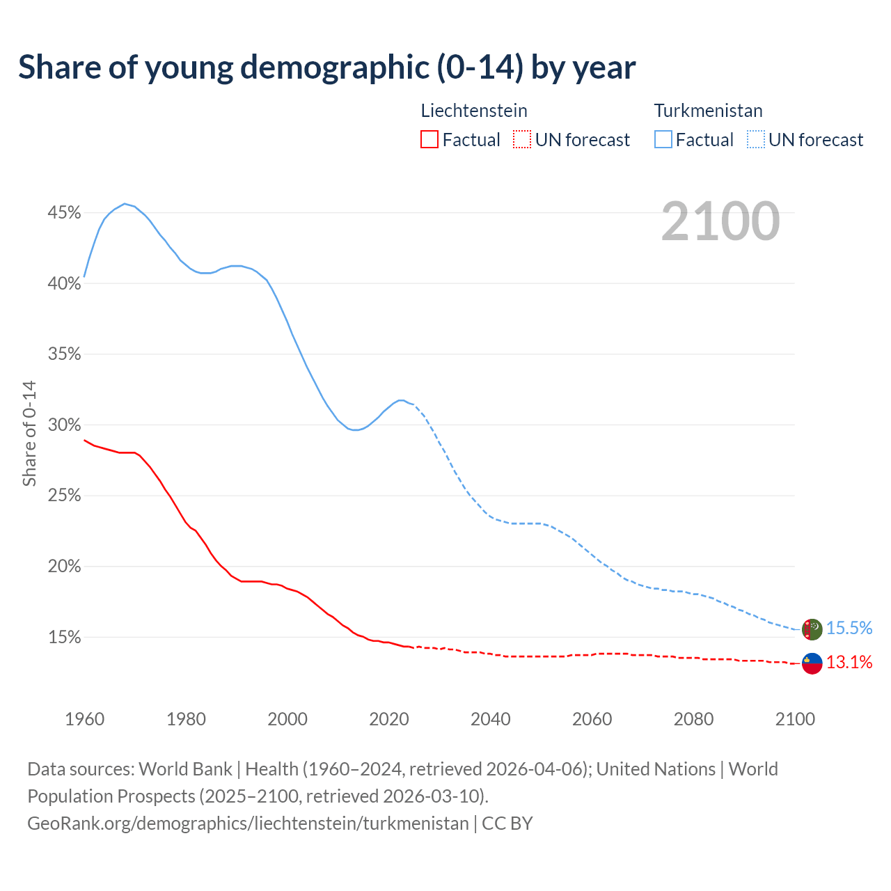 - The share of young demographic (0-15 years old) in Liechtenstein is 14.3% vs 31.5% in Turkmenistan.