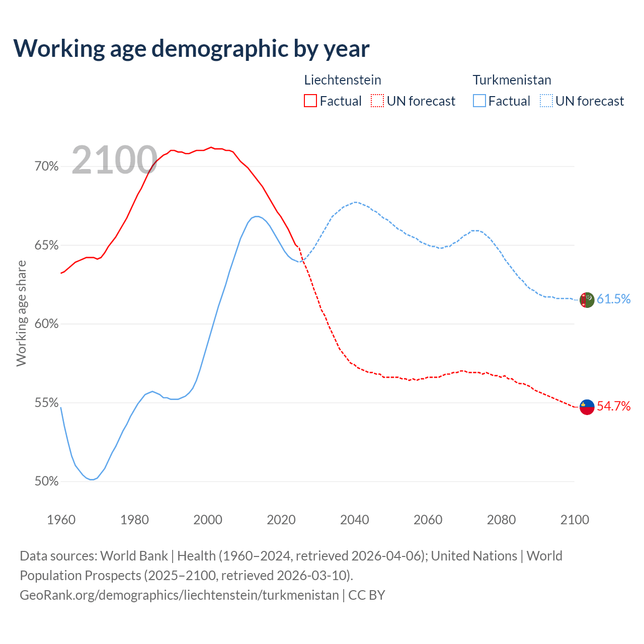 - Liechtenstein has 26.7K working age adults (aged 15-64) vs 4.97M in Turkmenistan.