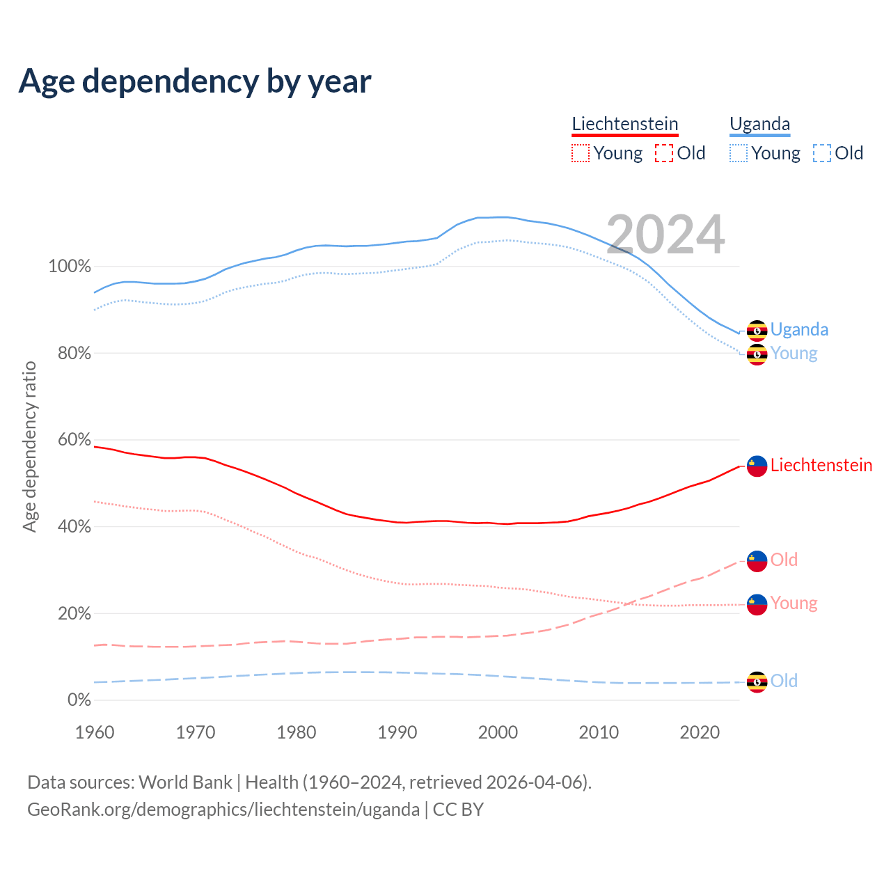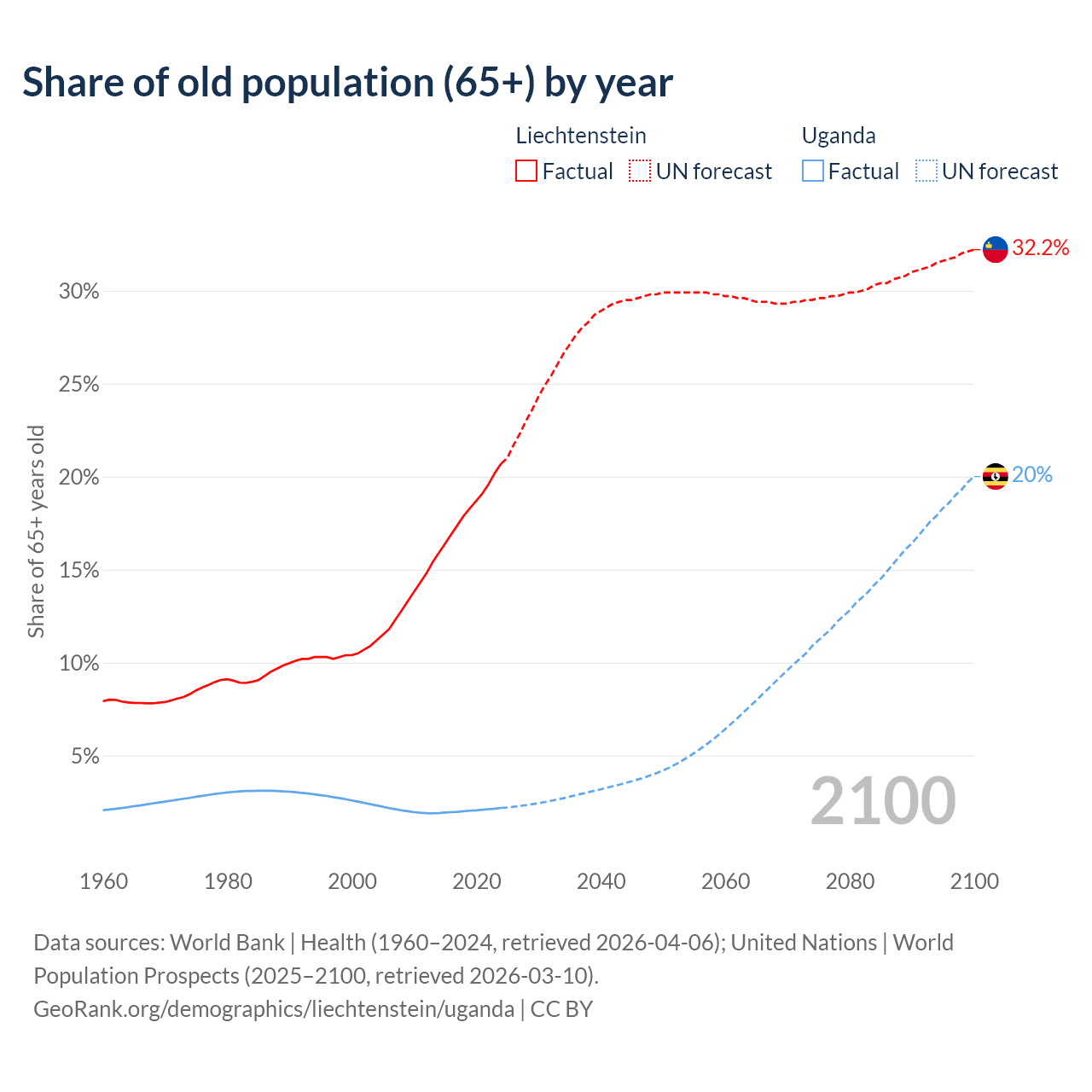 - The share of old-age demographic (65+) in Liechtenstein is 20.7% vs 2.19% in Uganda.