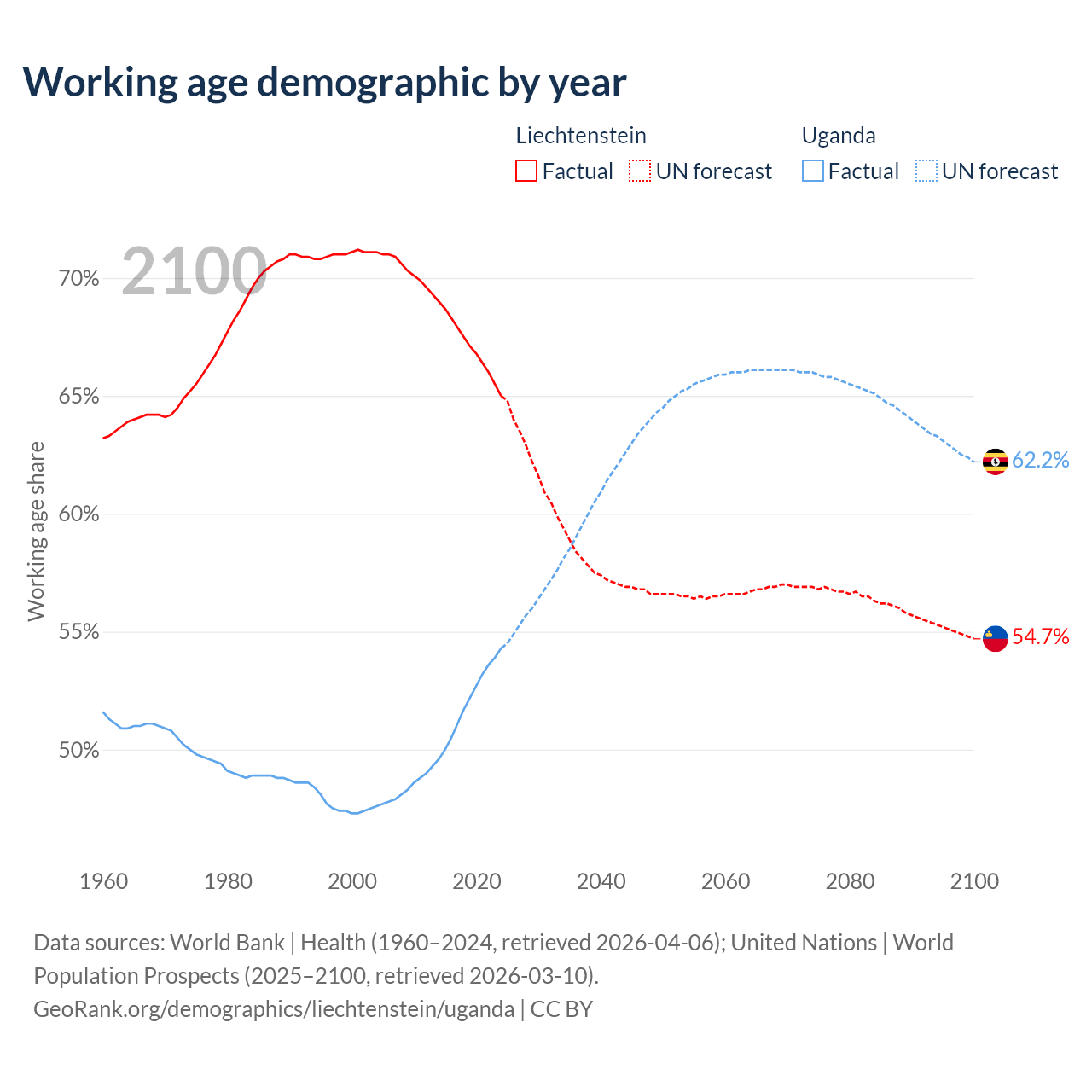 - Liechtenstein has 26.7K working age adults (aged 15-64) vs 28.9M in Uganda.
