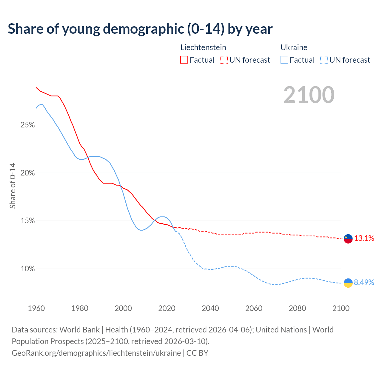 - The share of young demographic (0-15 years old) in Liechtenstein is 14.3% vs 13.9% in Ukraine.