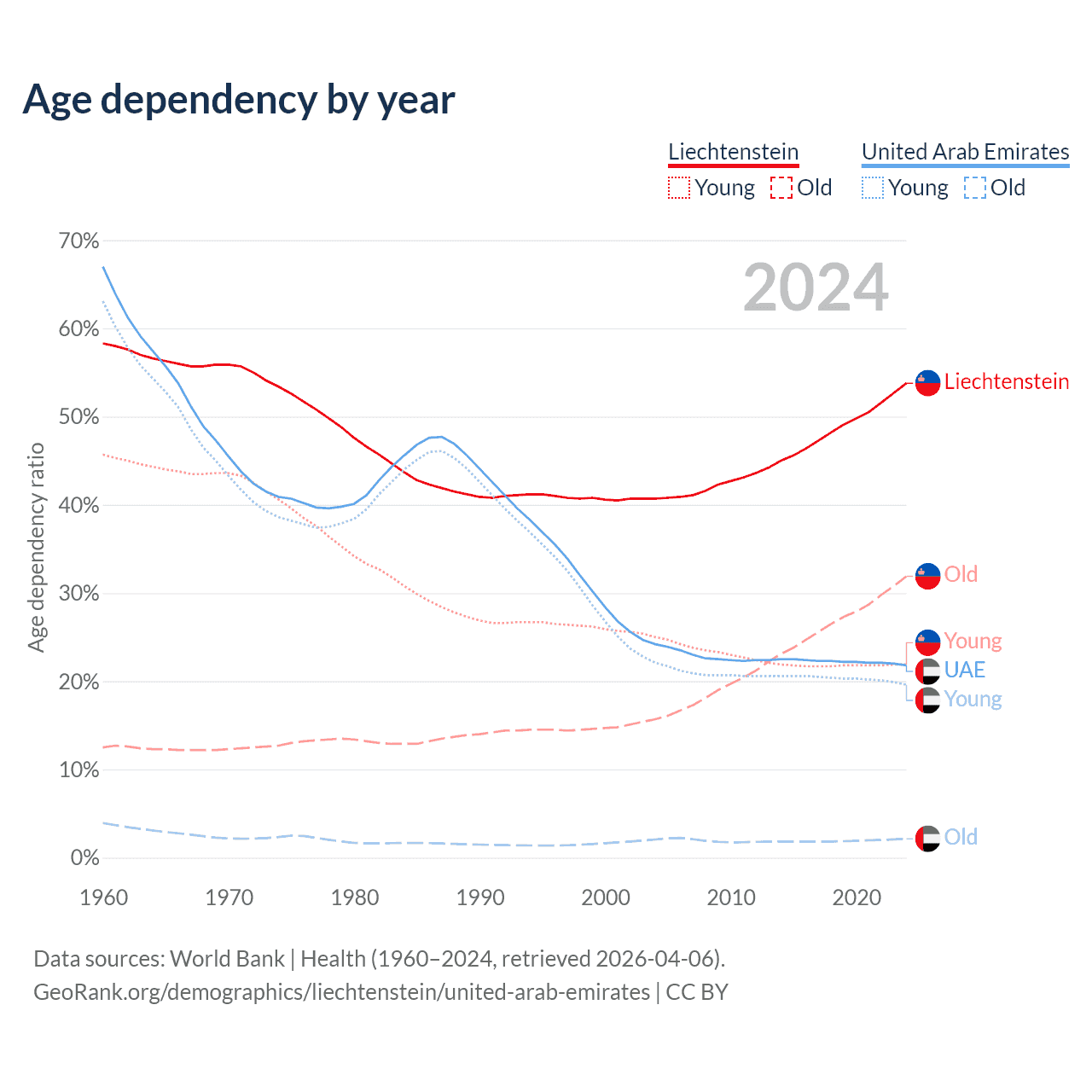 - The share of old-age demographic (65+) in Liechtenstein is 20.7% vs 1.77% in the United Arab Emirates.