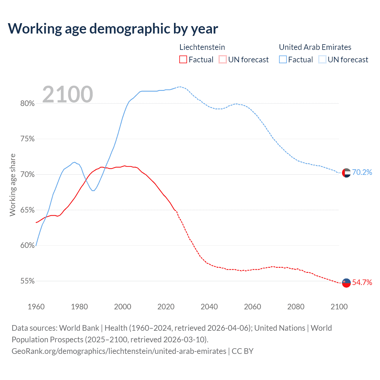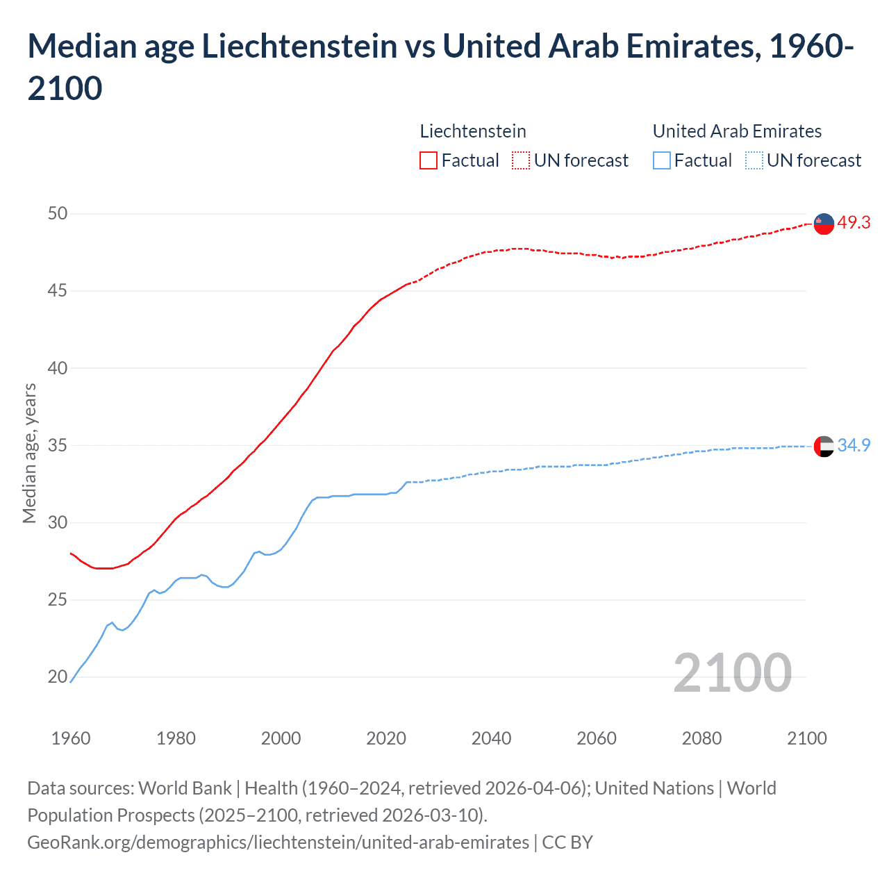 Median age Liechtenstein vs United Arab Emirates, 1960-2100