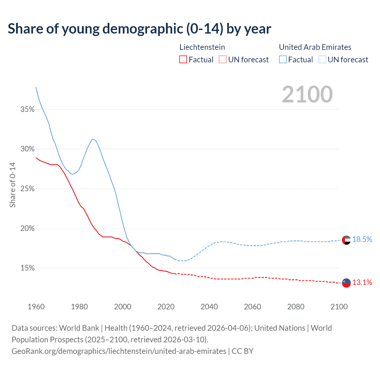 - The share of young demographic (0-15 years old) in Liechtenstein is 14.3% vs 16.1% in the United Arab Emirates.