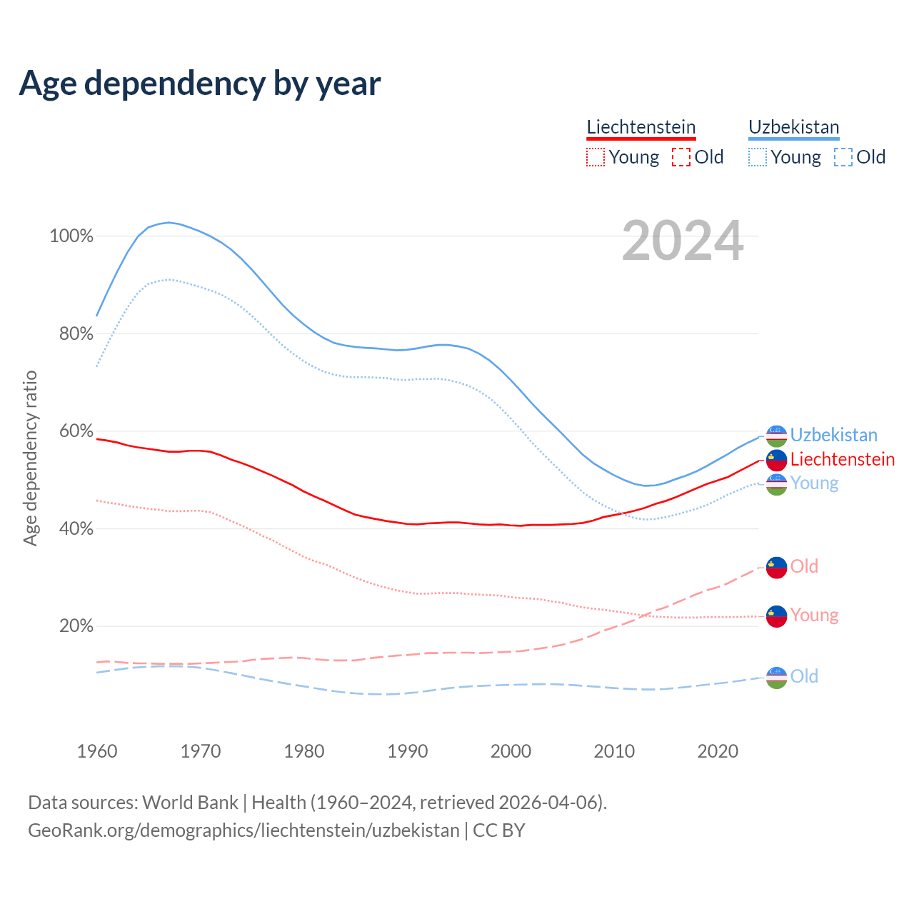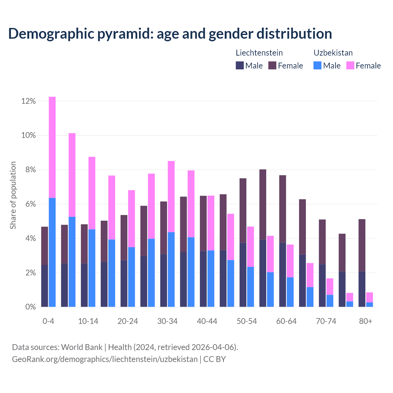 - Liechtenstein is ranked 13/196 by median age (oldest to youngest) vs 116/196 for Uzbekistan.