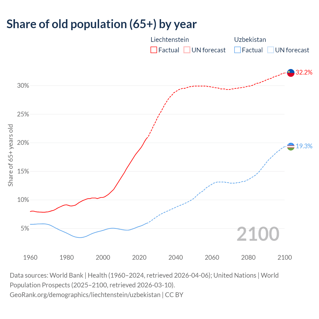 The share of older people aged 65 and over is 20.7% in Liechtenstein and 5.86% in Uzbekistan. Life expectancy in Liechtenstein compared to Uzbekistan .
