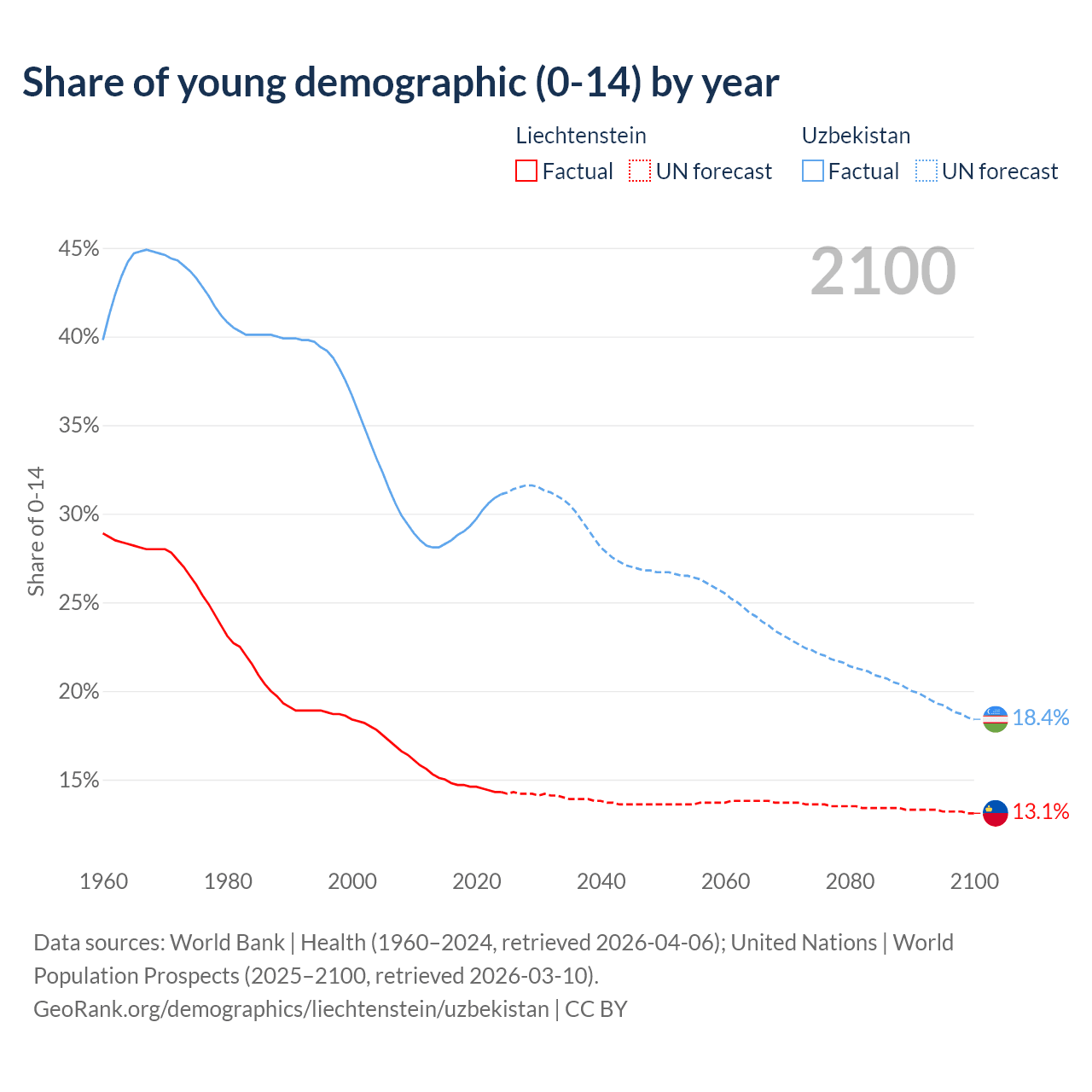 - The share of young demographic (0-15 years old) in Liechtenstein is 14.3% vs 31.1% in Uzbekistan.
