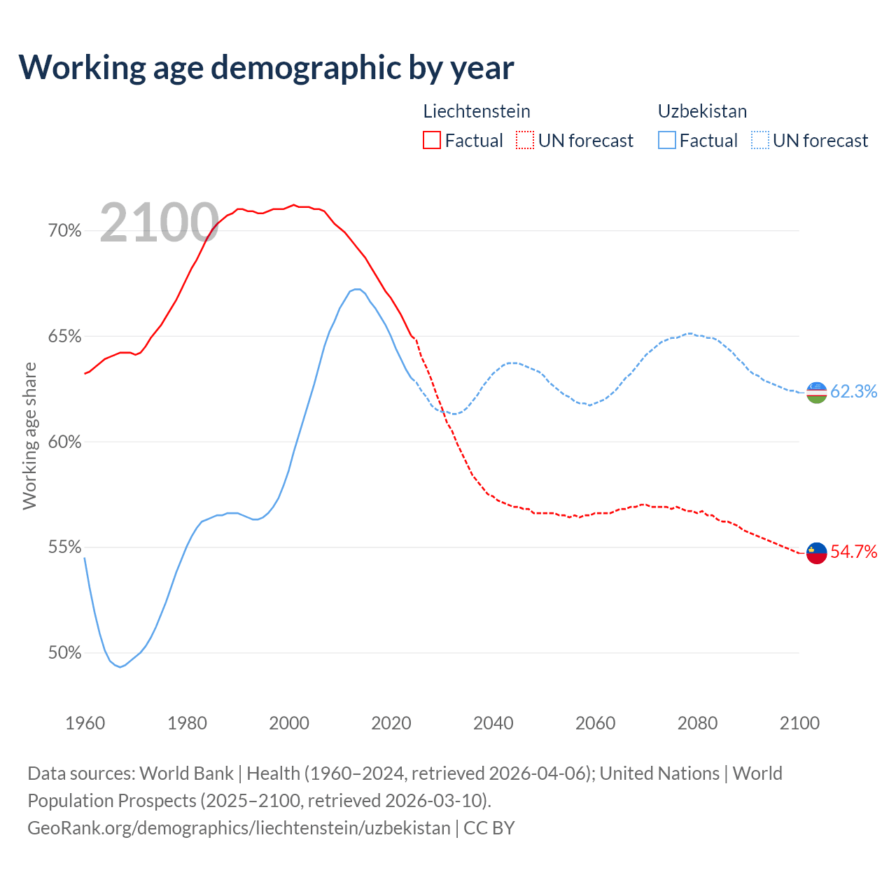 - Liechtenstein has 26.7K working age adults (aged 15-64) vs 23.9M in Uzbekistan.
