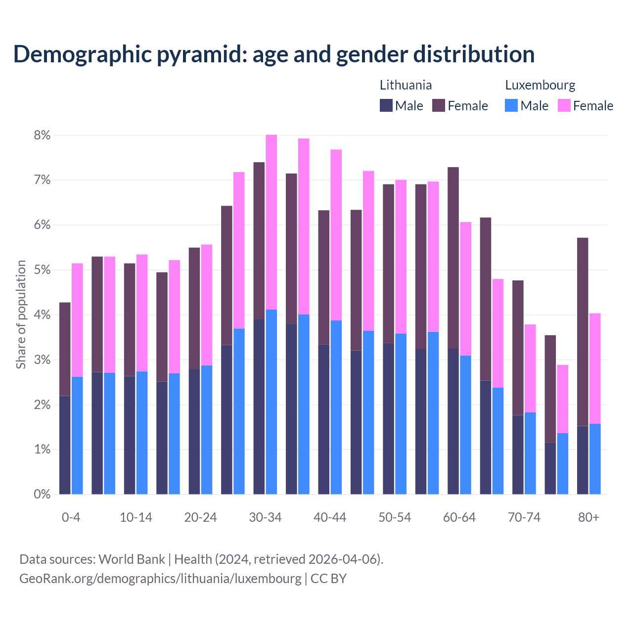 - Lithuania is ranked 28/196 by median age (oldest to youngest) vs 46/196 for Luxembourg.