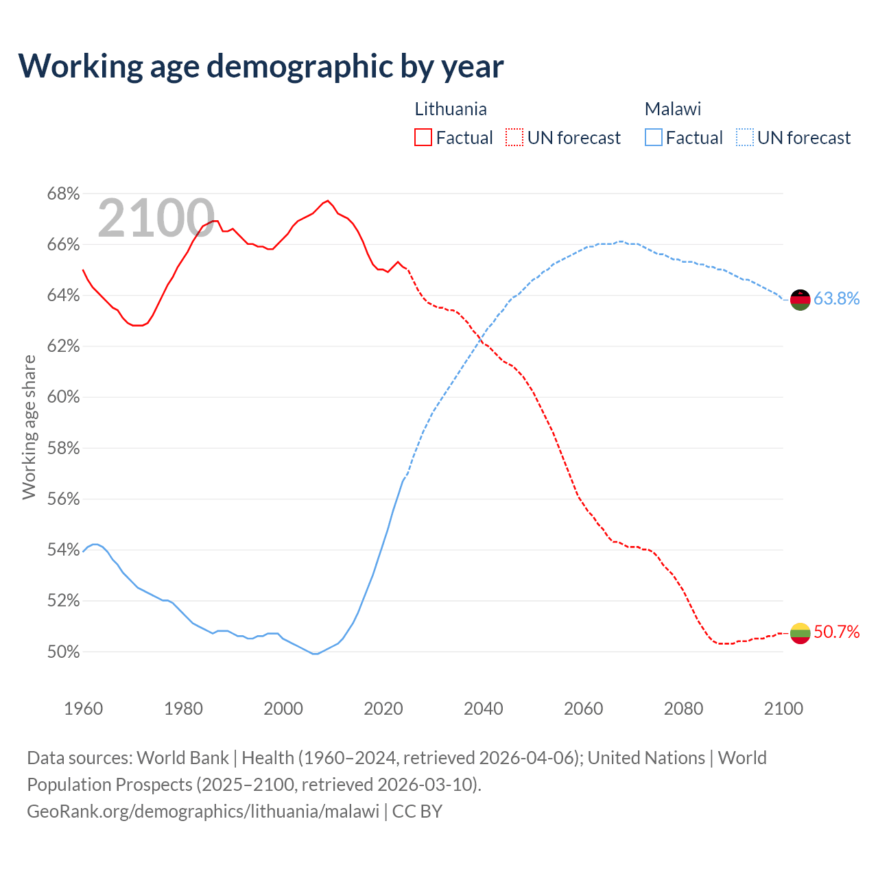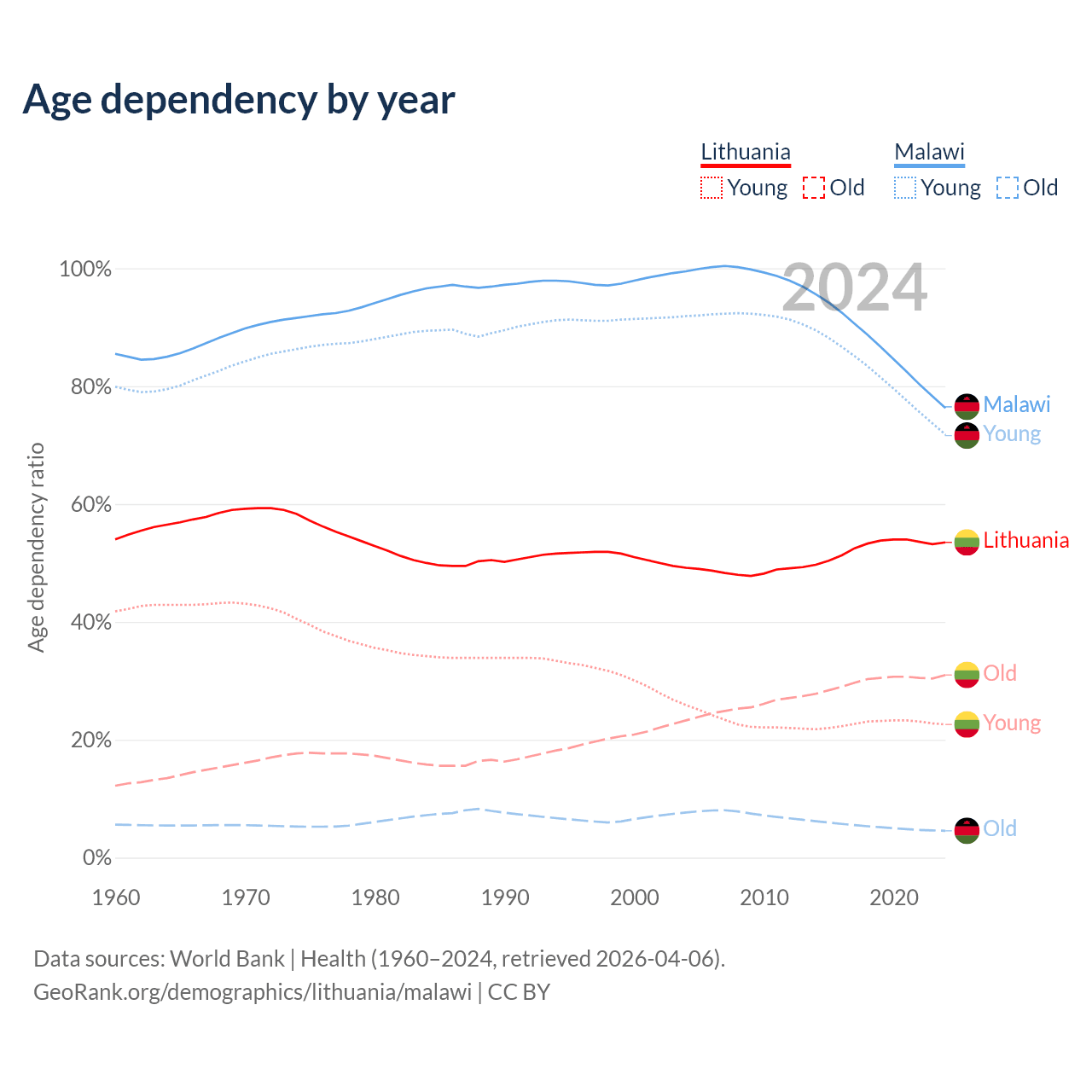- The share of old-age demographic (65+) in Lithuania is 20.2% vs 2.59% in Malawi.