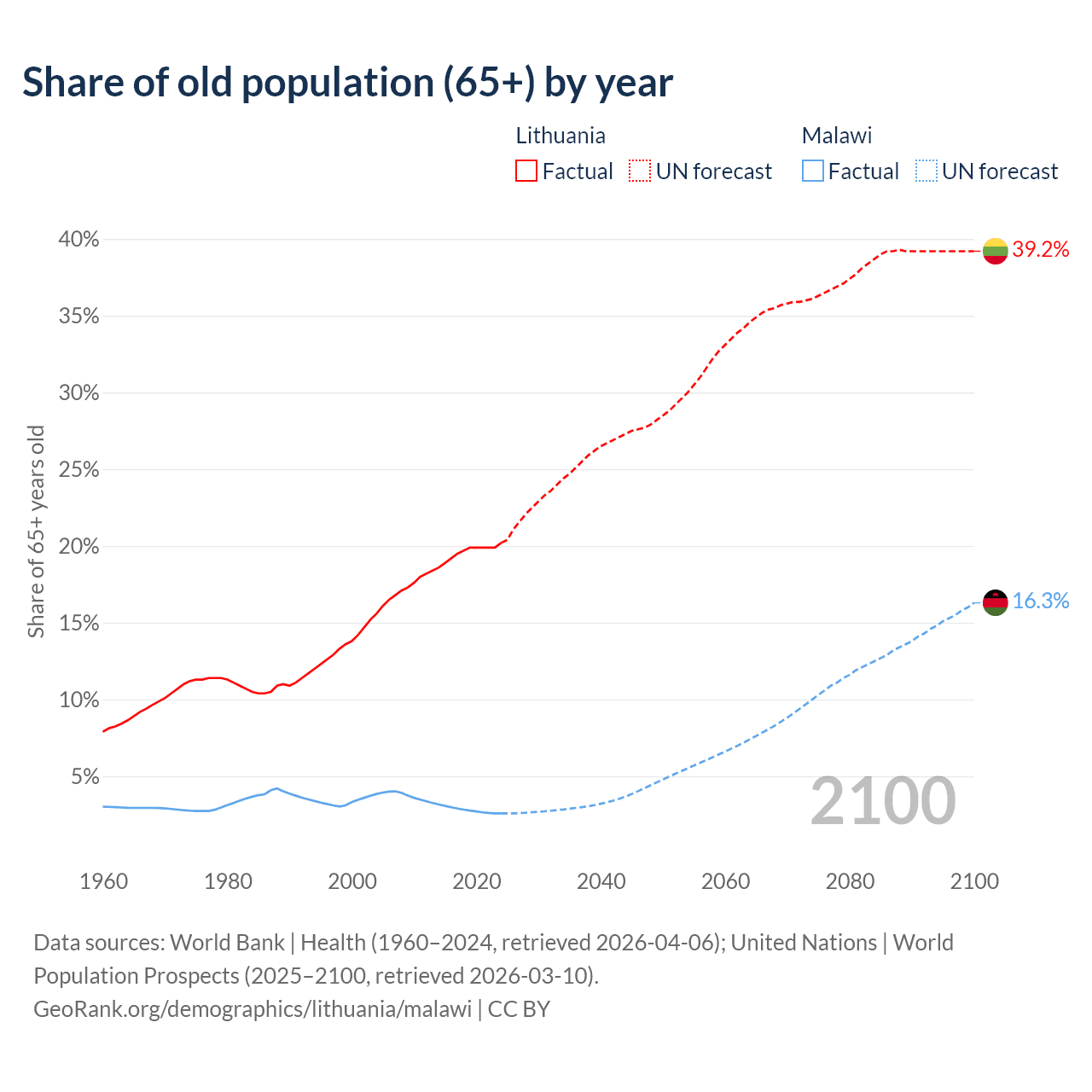 The share of older people aged 65 and over is 20.2% in Lithuania and 2.59% in Malawi. Life expectancy in Lithuania compared to Malawi .