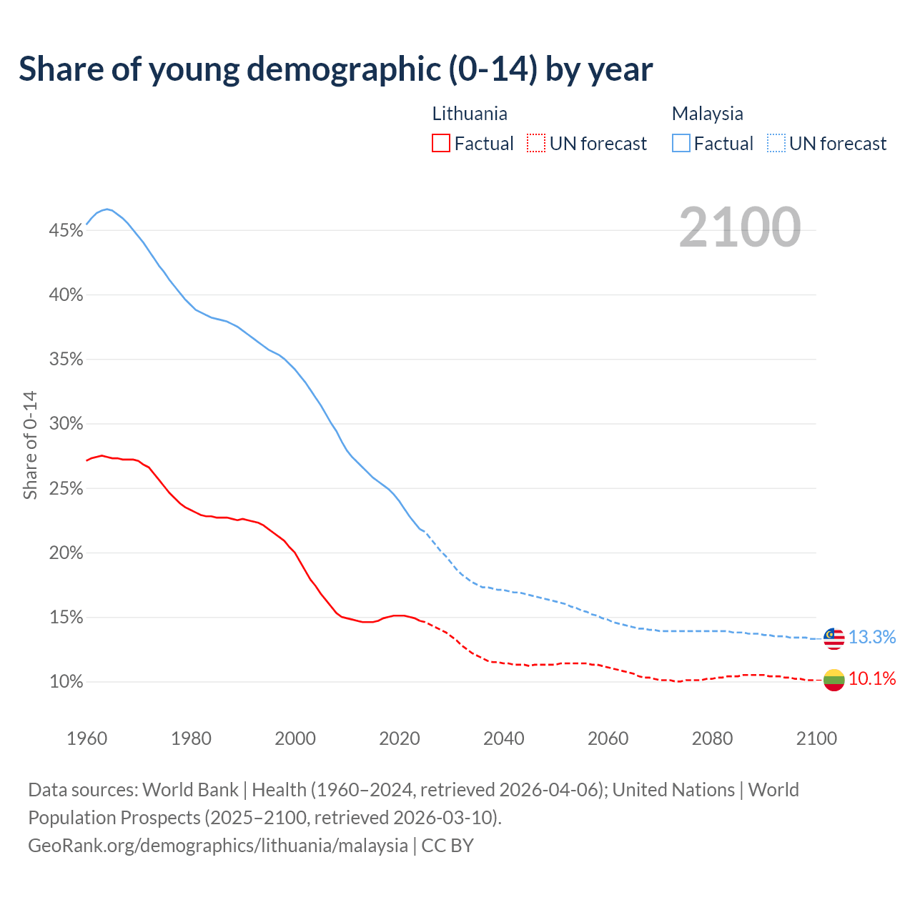- The share of young demographic (0-15 years old) in Lithuania is 14.7% vs 21.8% in Malaysia.