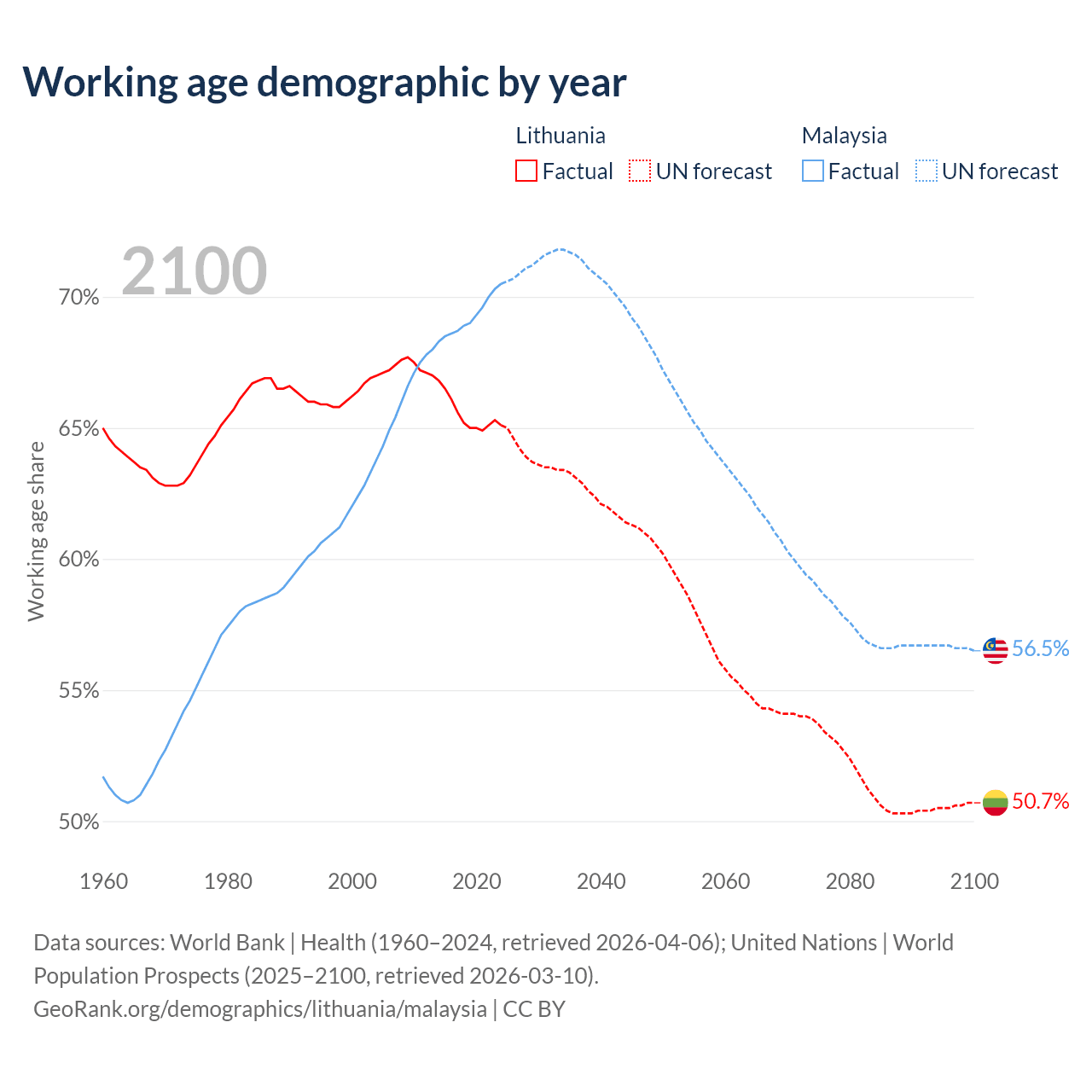 Median age Lithuania vs Malaysia, 1960-2100