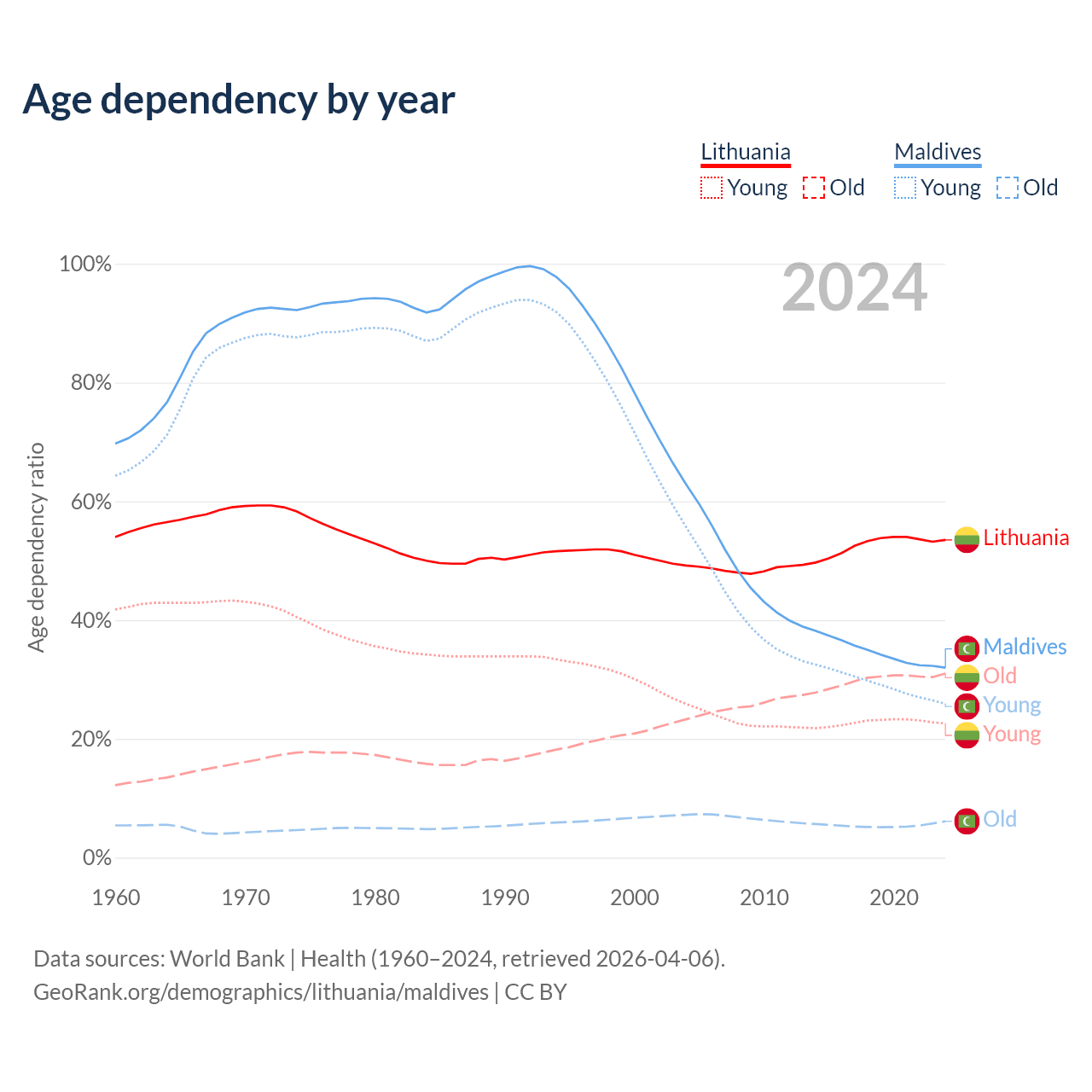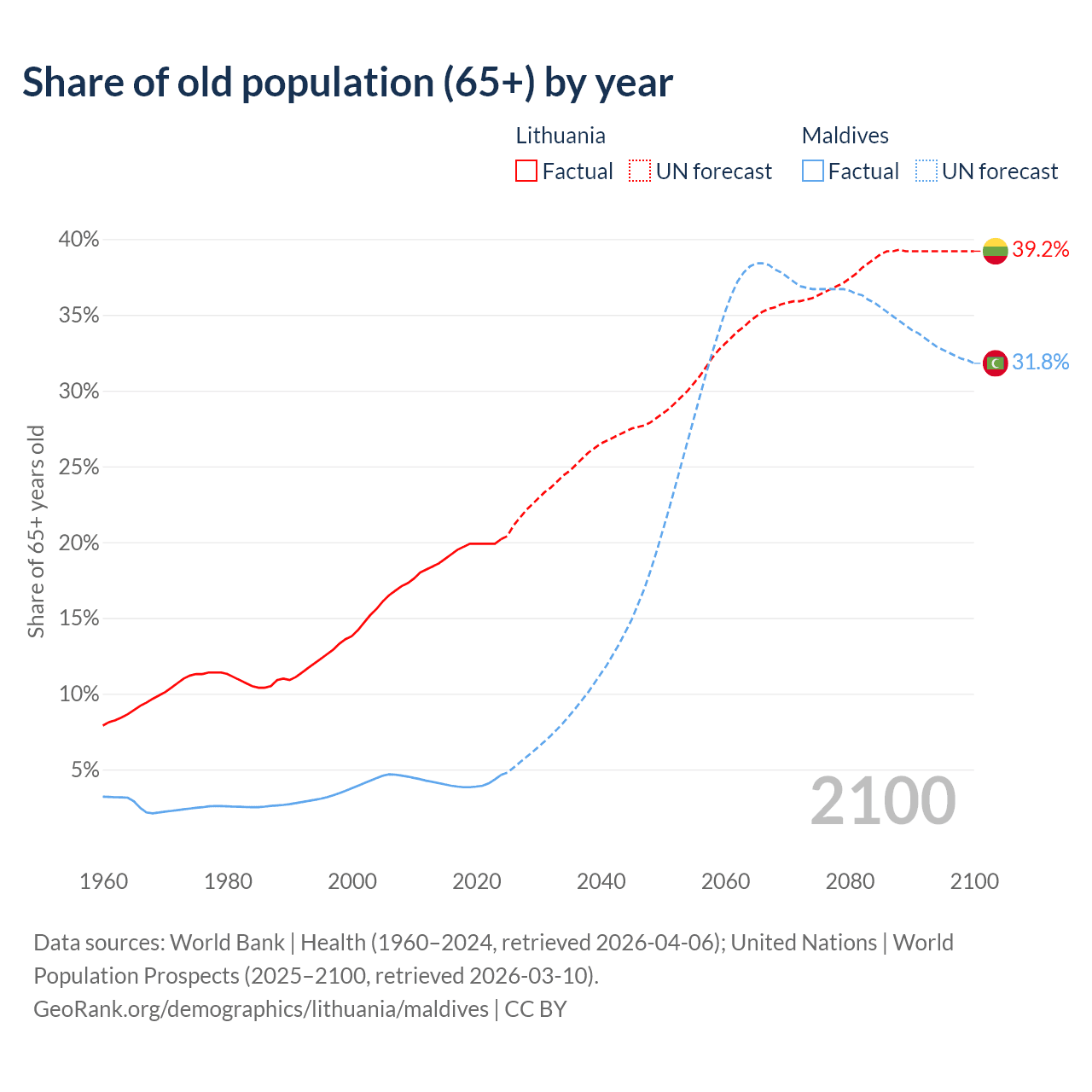 - The share of old-age demographic (65+) in Lithuania is 20.2% vs 4.64% in Maldives.