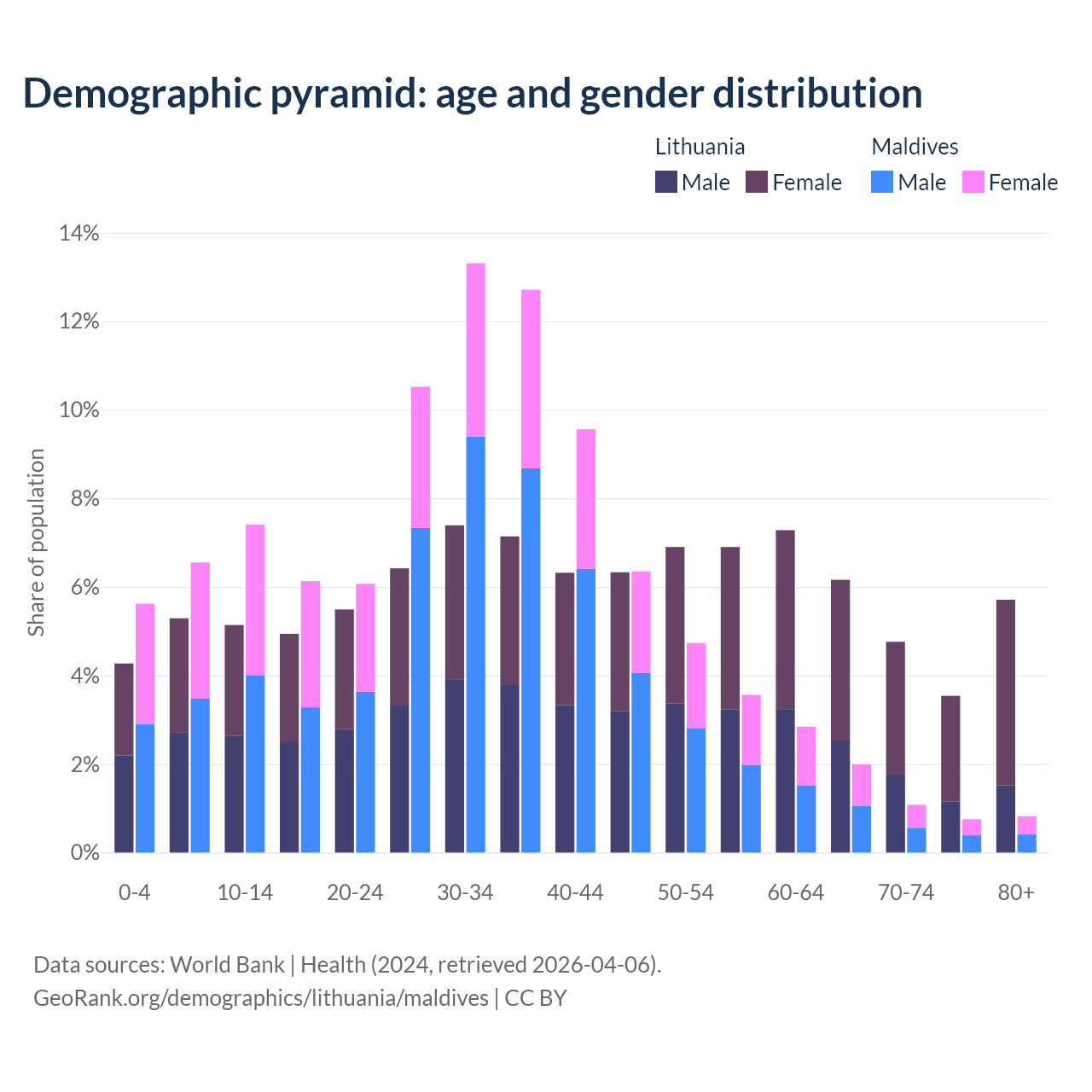 - Lithuania is ranked 28/196 by median age (oldest to youngest) vs 90/196 for Maldives.