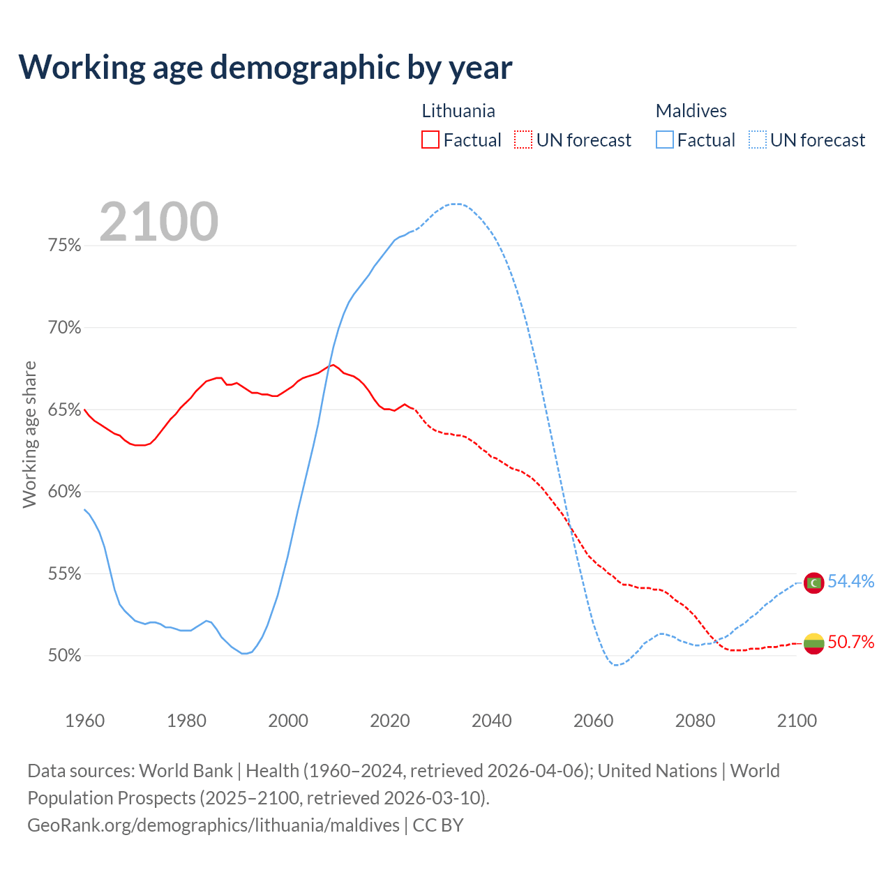 - Lithuania has 1.84M working age adults (aged 15-64) vs 403K in Maldives.