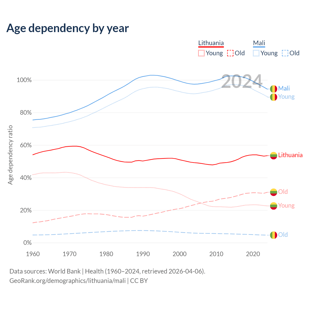 - The share of old-age demographic (65+) in Lithuania is 20.2% vs 2.38% in Mali.