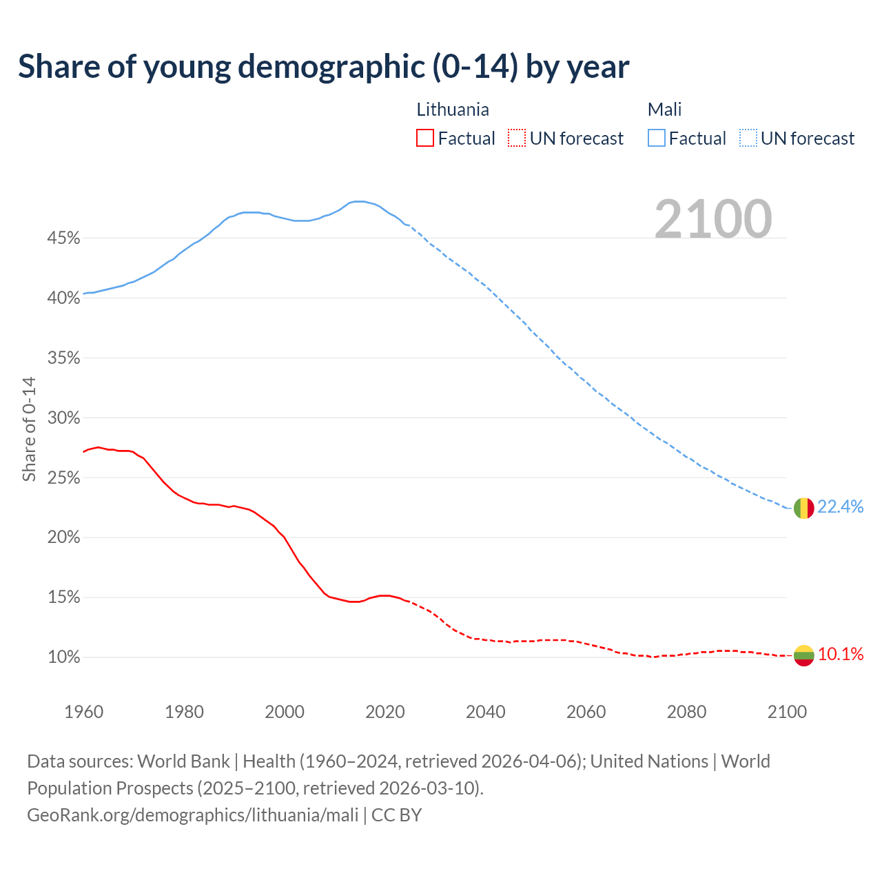 - The share of young demographic (0-15 years old) in Lithuania is 14.7% vs 46.1% in Mali.
