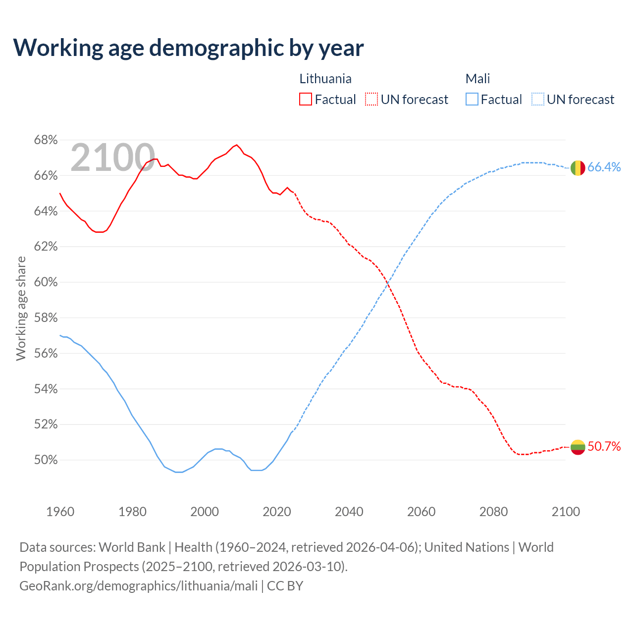 - Lithuania has 1.84M working age adults (aged 15-64) vs 13.5M in Mali.