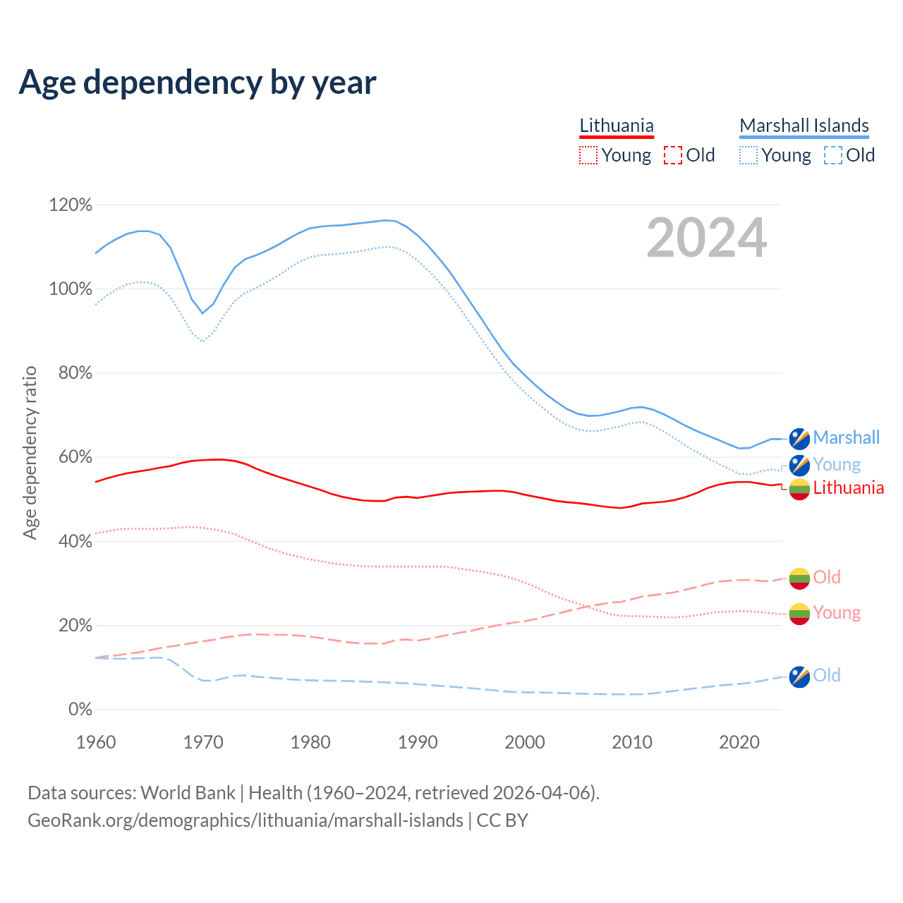 - The share of old-age demographic (65+) in Lithuania is 20.2% vs 4.64% in the Marshall Islands.