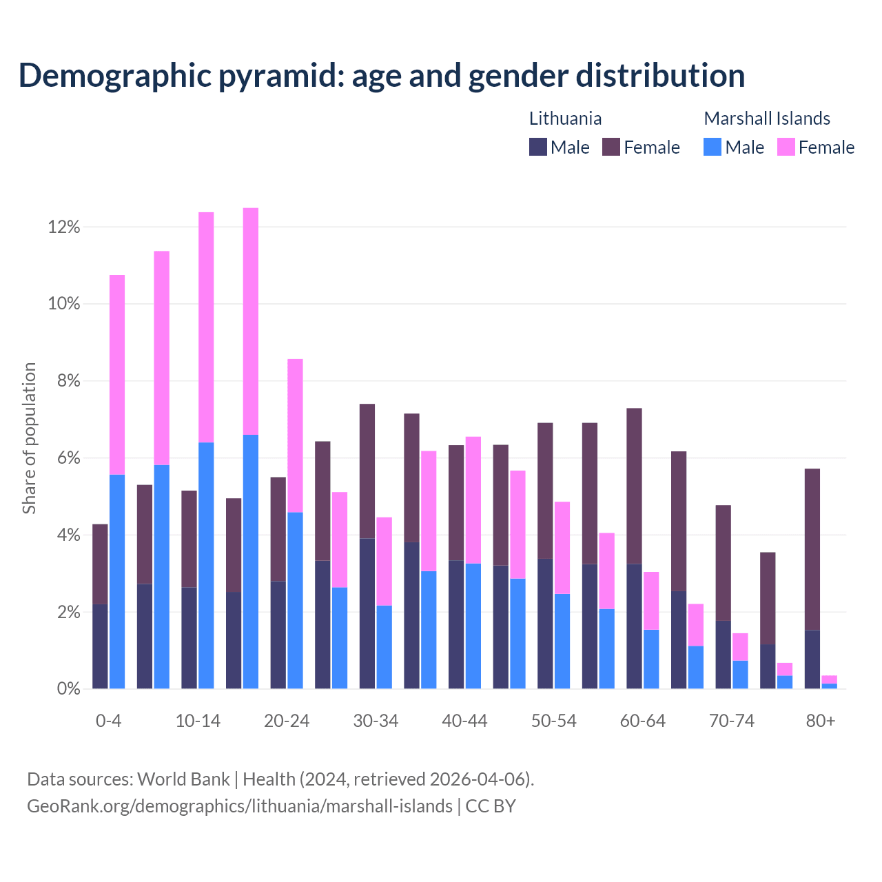 - As of 2026, the population of Lithuania is 2.83M vs 35.1K in the Marshall Islands - 80.7 times difference.