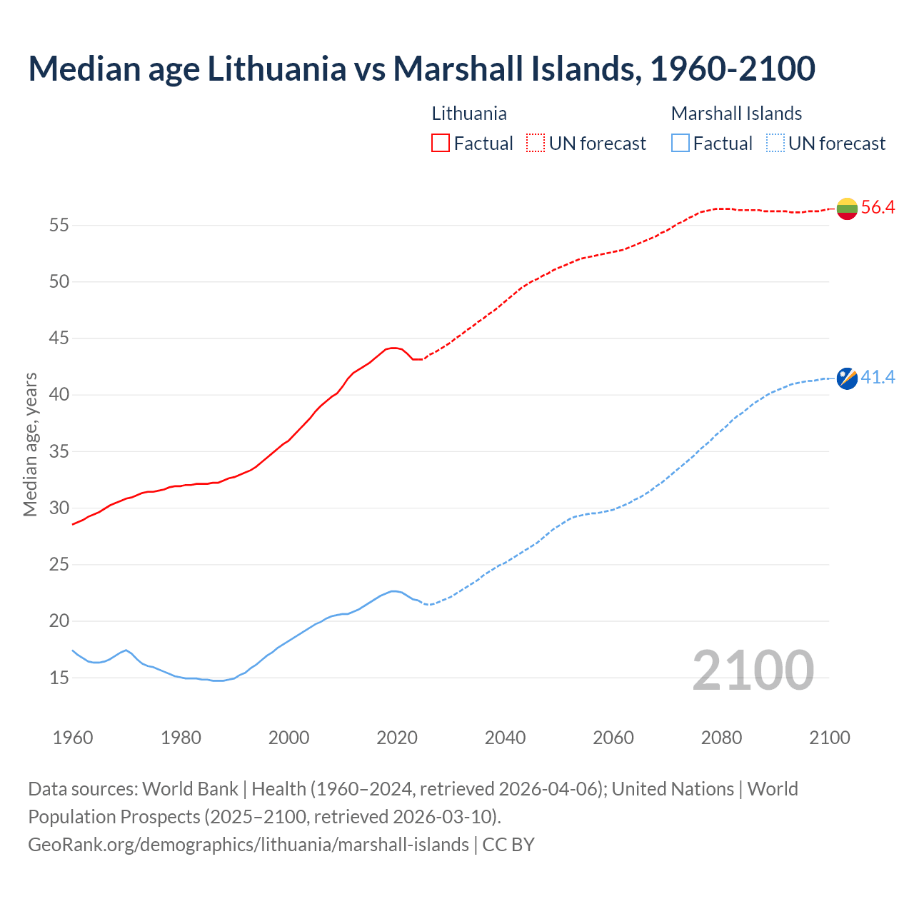 Median age Lithuania vs Marshall Islands, 1960-2100