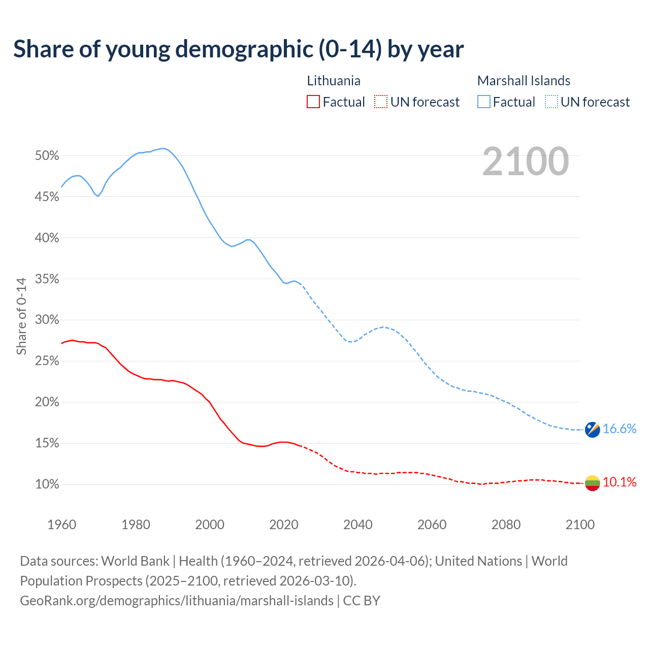 - The share of young demographic (0-15 years old) in Lithuania is 14.7% vs 34.5% in the Marshall Islands.