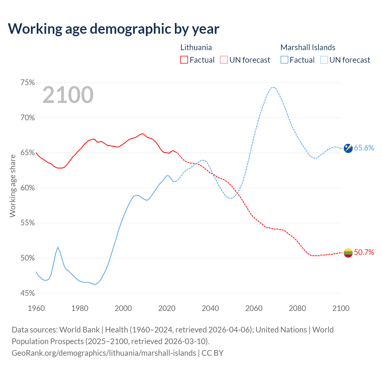 - Lithuania has 1.84M working age adults (aged 15-64) vs 21.3K in the Marshall Islands.