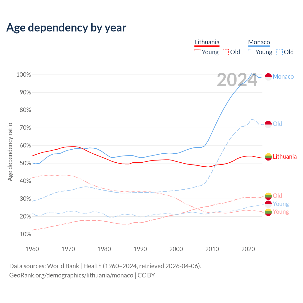 - The share of old-age demographic (65+) in Lithuania is 20.2% vs 36.2% in Monaco.