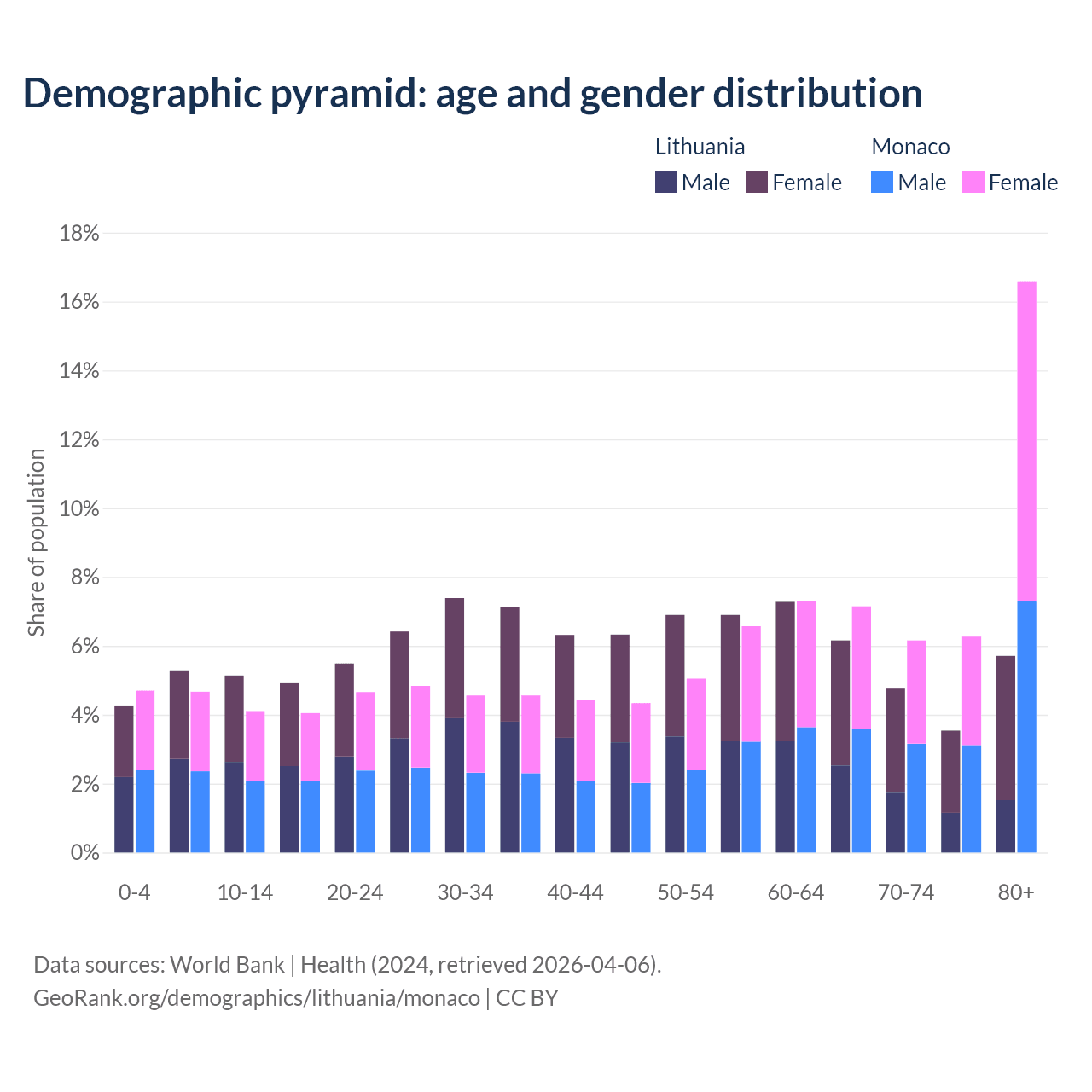 The share of older people aged 65 and over is 20.2% in Lithuania and 36.2% in Monaco. Life expectancy in Lithuania compared to Monaco .