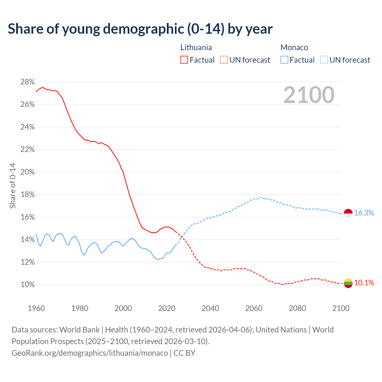 - The share of young demographic (0-15 years old) in Lithuania is 14.7% vs 13.5% in Monaco.