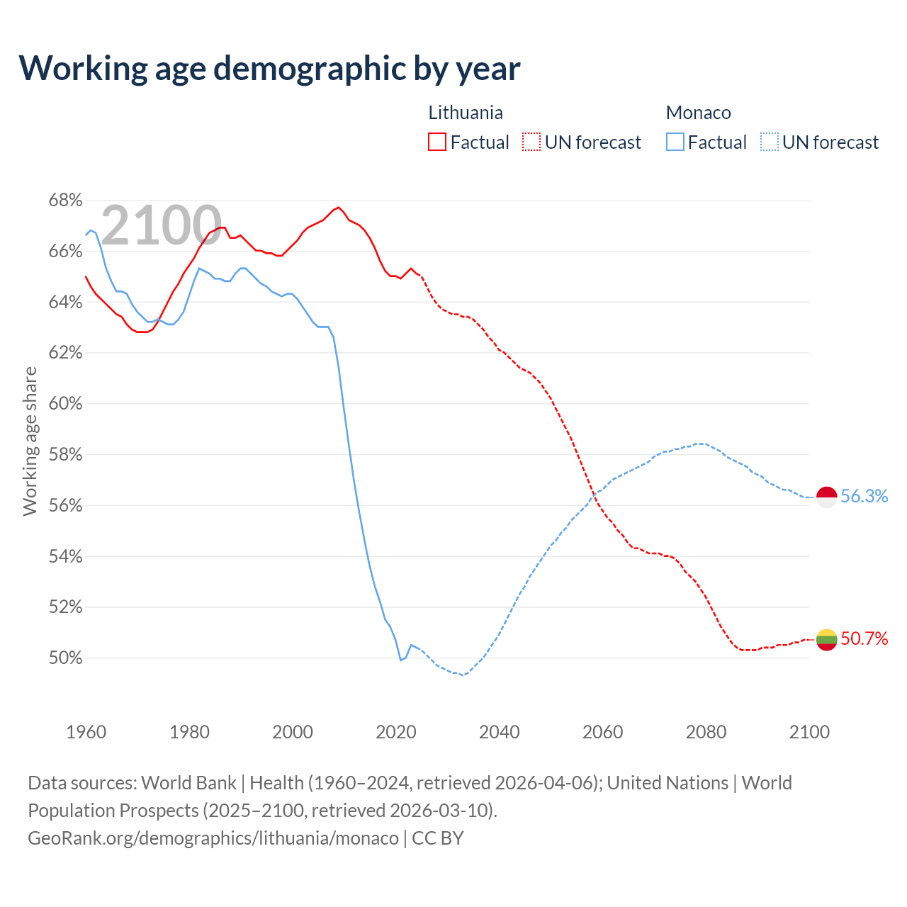 Median age Lithuania vs Monaco, 1960-2100