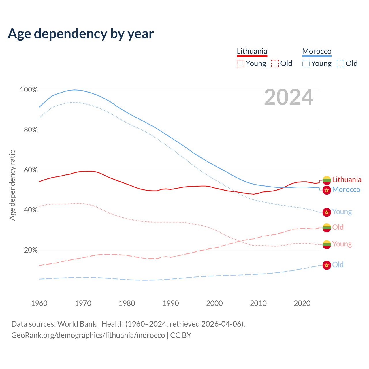 - Lithuania is ranked 28/196 by median age (oldest to youngest) vs 100/196 for Morocco.