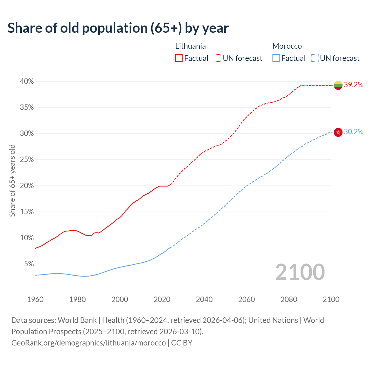 The share of older people aged 65 and over is 20.2% in Lithuania and 8.14% in Morocco. Life expectancy in Lithuania compared to Morocco .