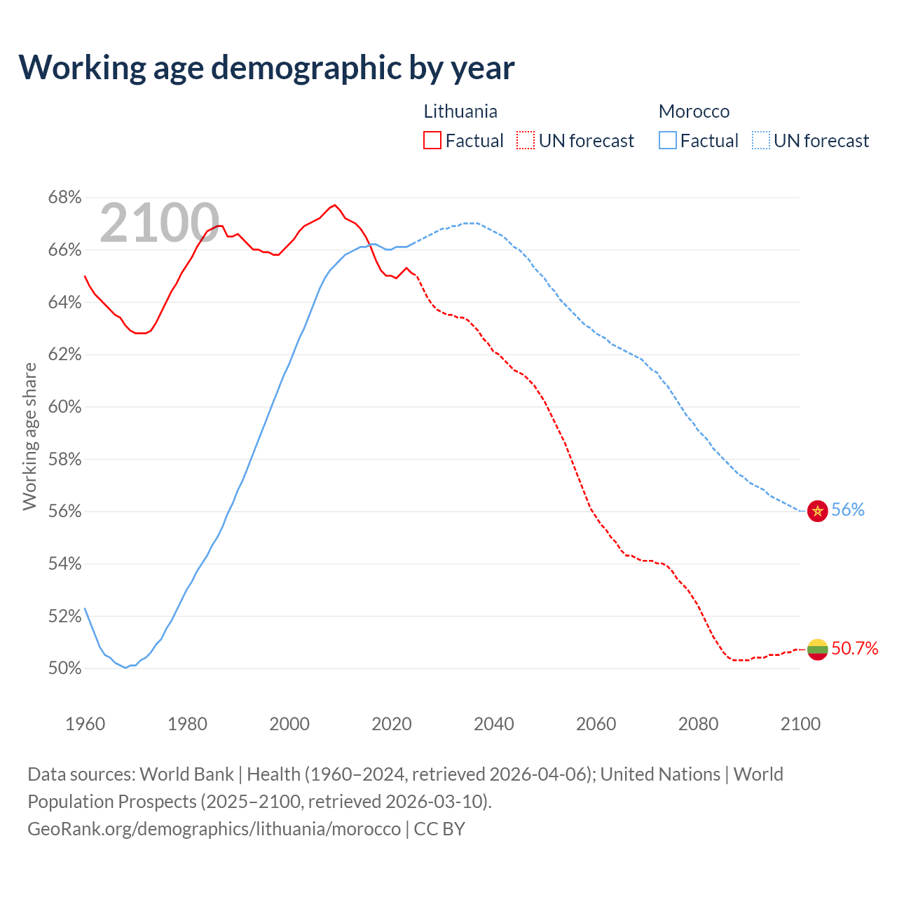 - Lithuania has 1.84M working age adults (aged 15-64) vs 25.7M in Morocco.