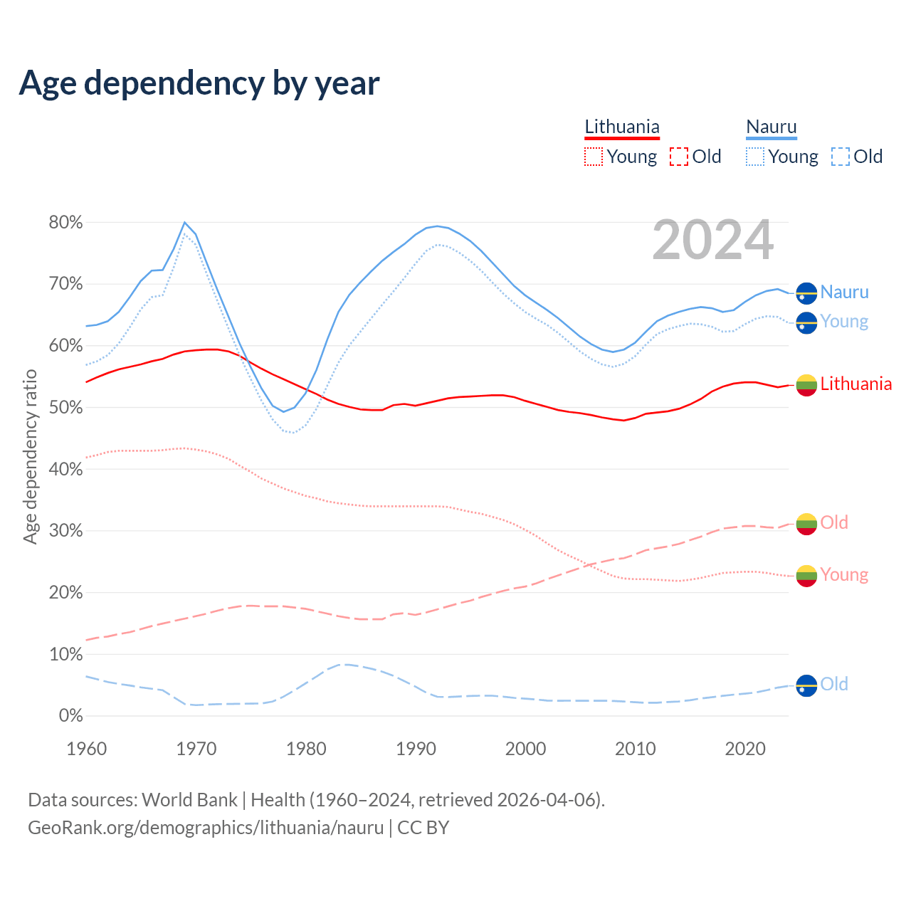 - The share of old-age demographic (65+) in Lithuania is 20.2% vs 2.85% in Nauru.