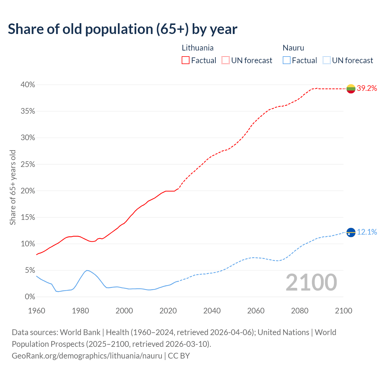 The share of older people aged 65 and over is 20.2% in Lithuania and 2.85% in Nauru. Life expectancy in Lithuania compared to Nauru .