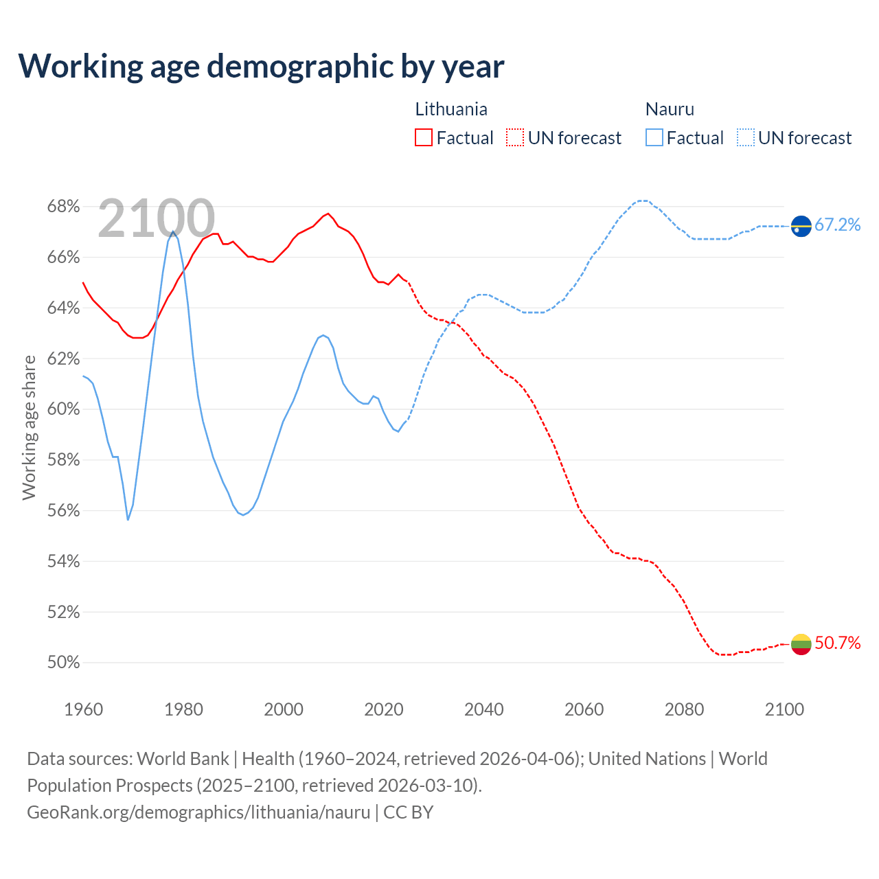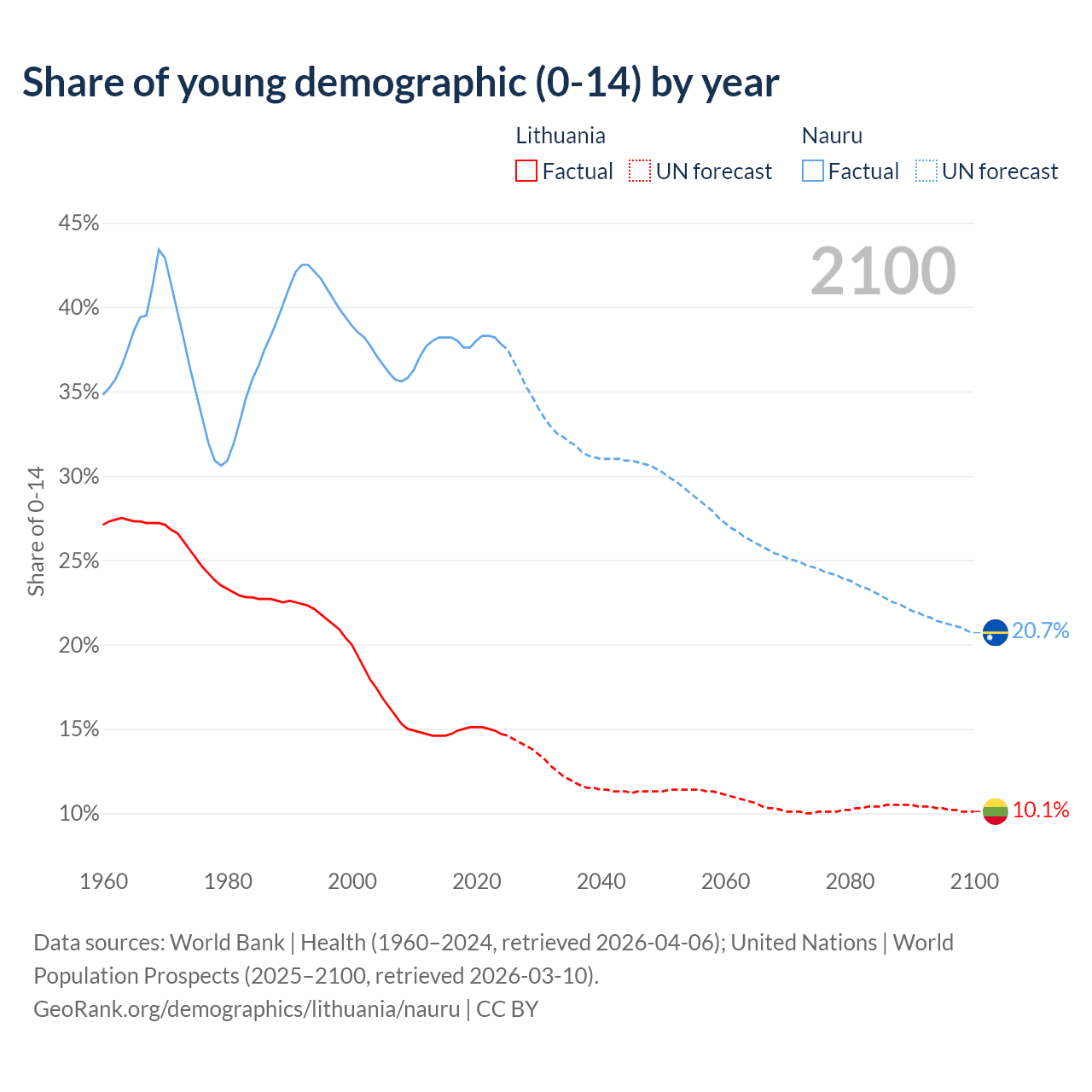 Median age Lithuania vs Nauru, 1960-2100