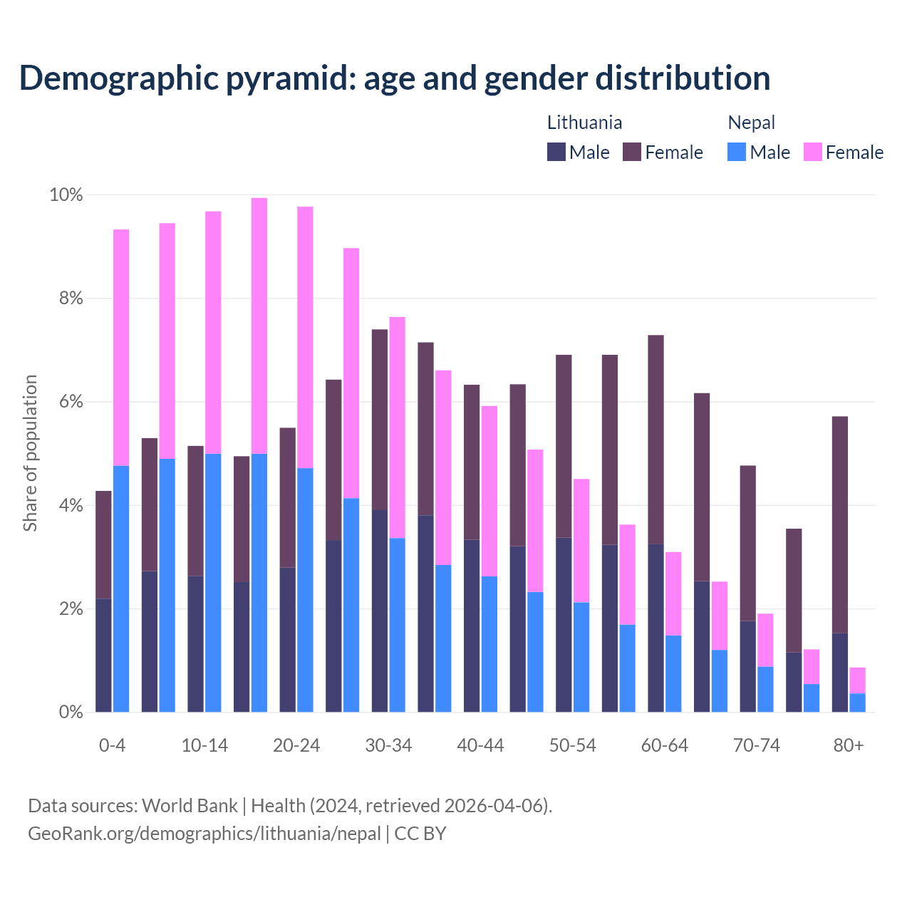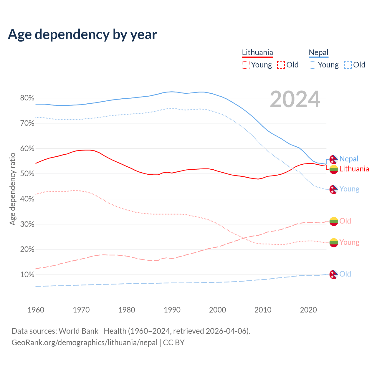 - The share of old-age demographic (65+) in Lithuania is 20.2% vs 6.5% in Nepal.