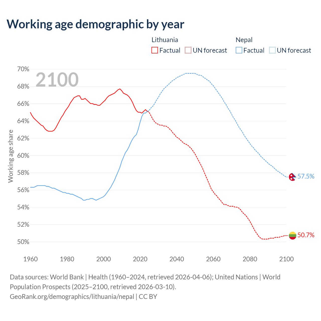 Median age Lithuania vs Nepal, 1960-2100