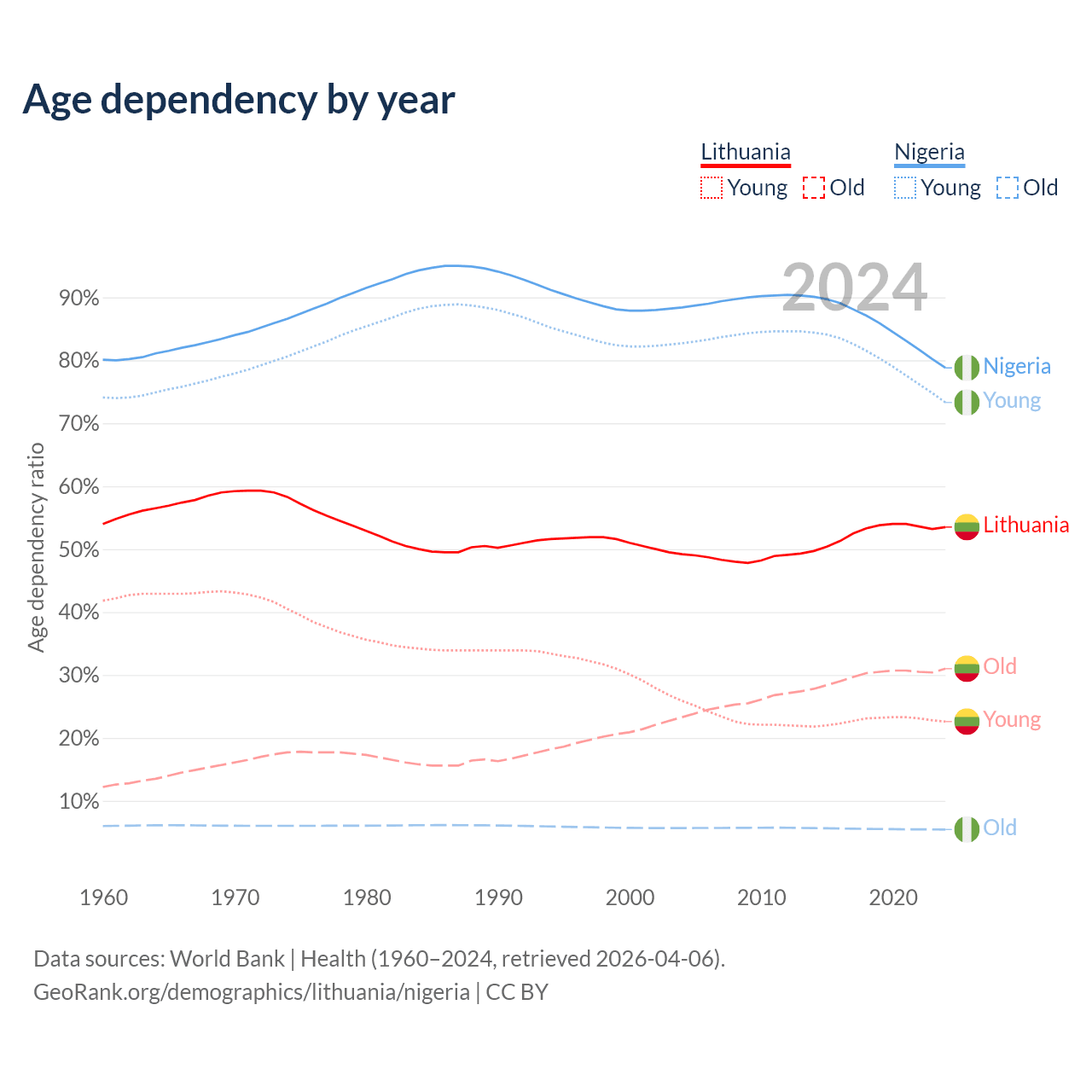 - The share of old-age demographic (65+) in Lithuania is 20.2% vs 3.05% in Nigeria.