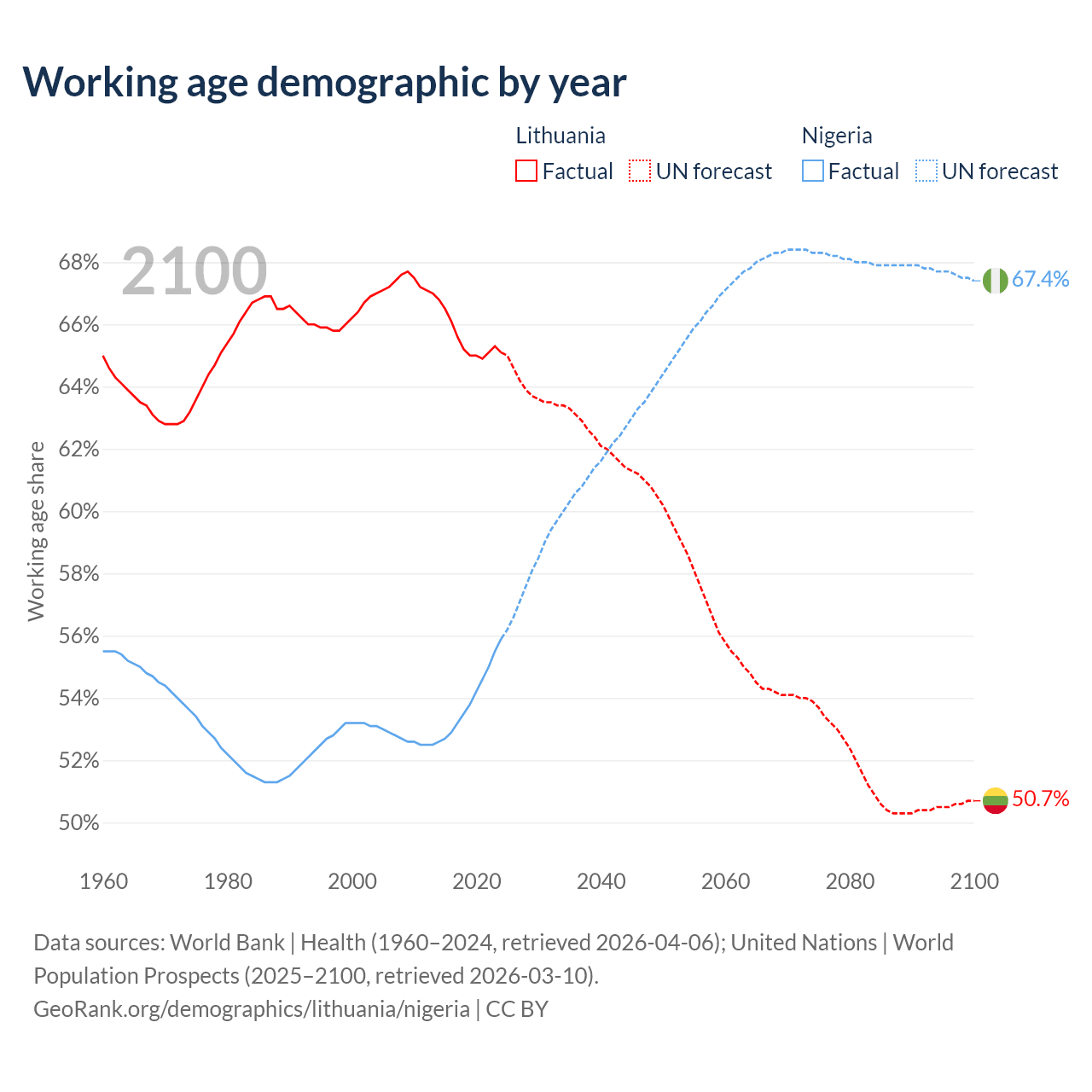 - Lithuania has 1.84M working age adults (aged 15-64) vs 136M in Nigeria.