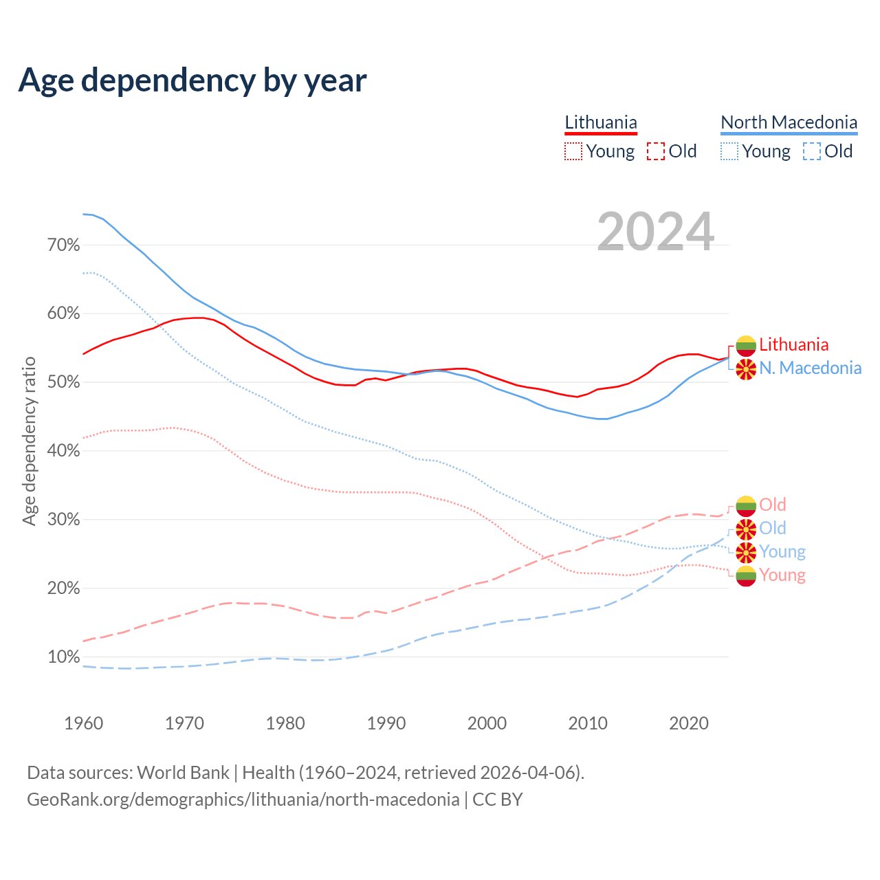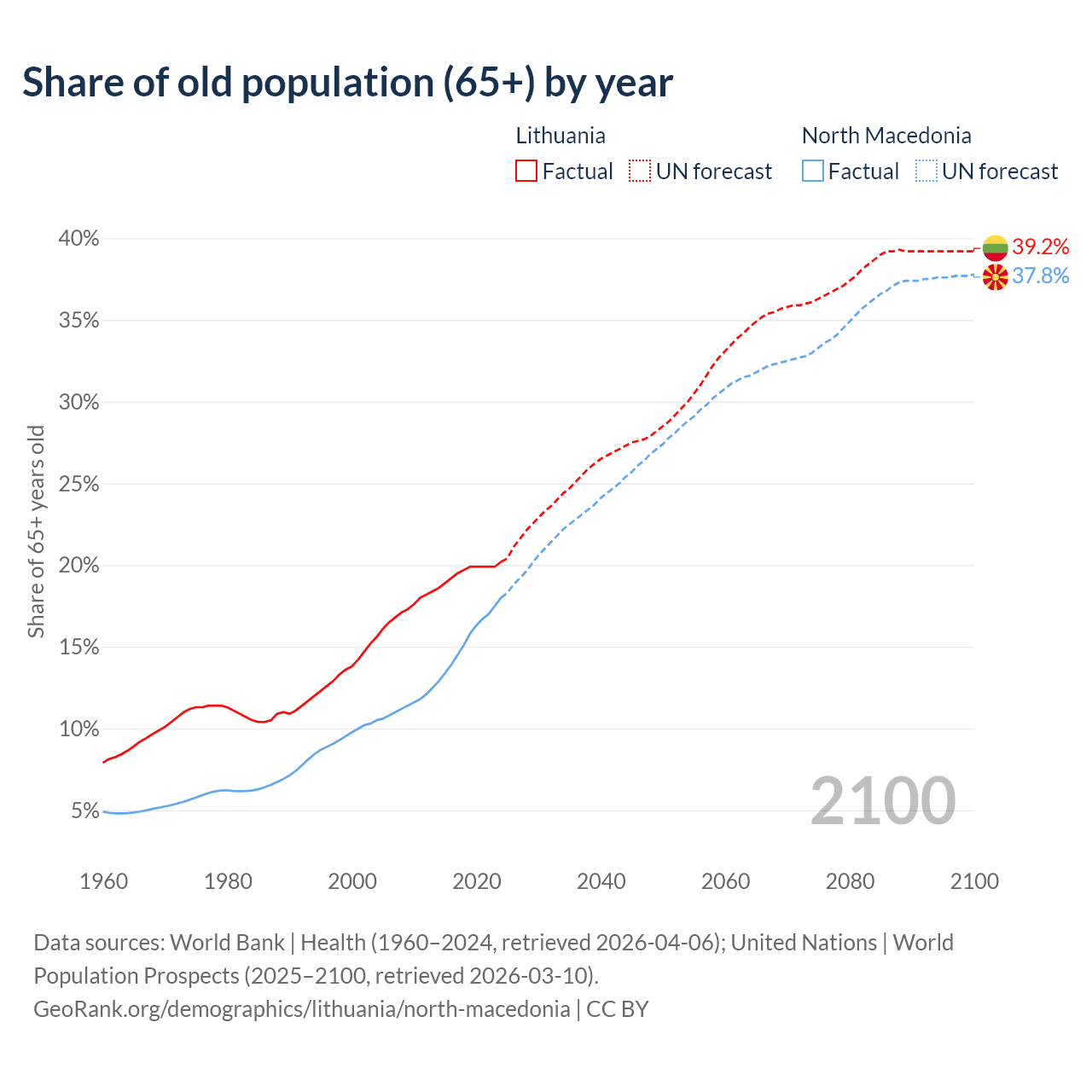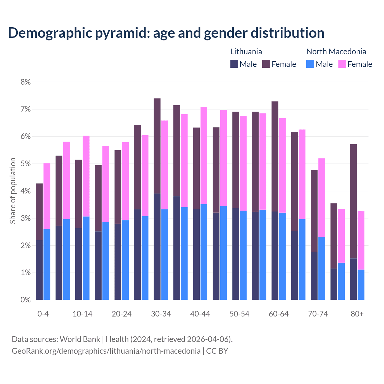 The share of older people aged 65 and over is 20.2% in Lithuania and 18% in North Macedonia. Life expectancy in Lithuania compared to North Macedonia .